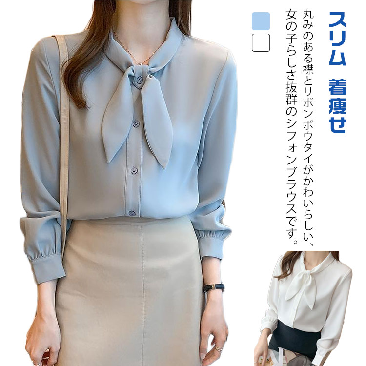 ブラウス レディース 長袖 リボンブラ トップス シャツ ブラウス 超目玉商品 ホワイト ブルー S M L XL 2XL 3XL