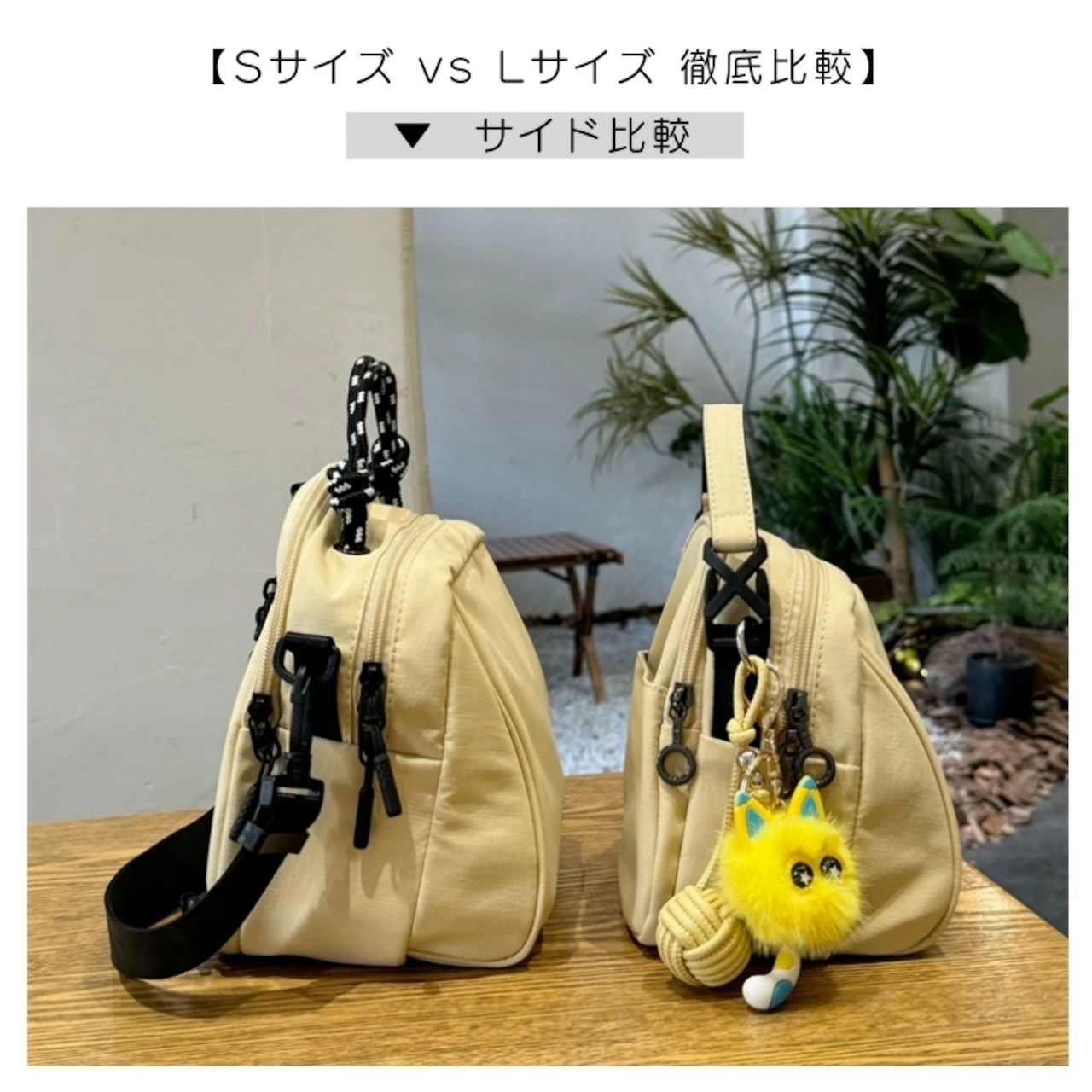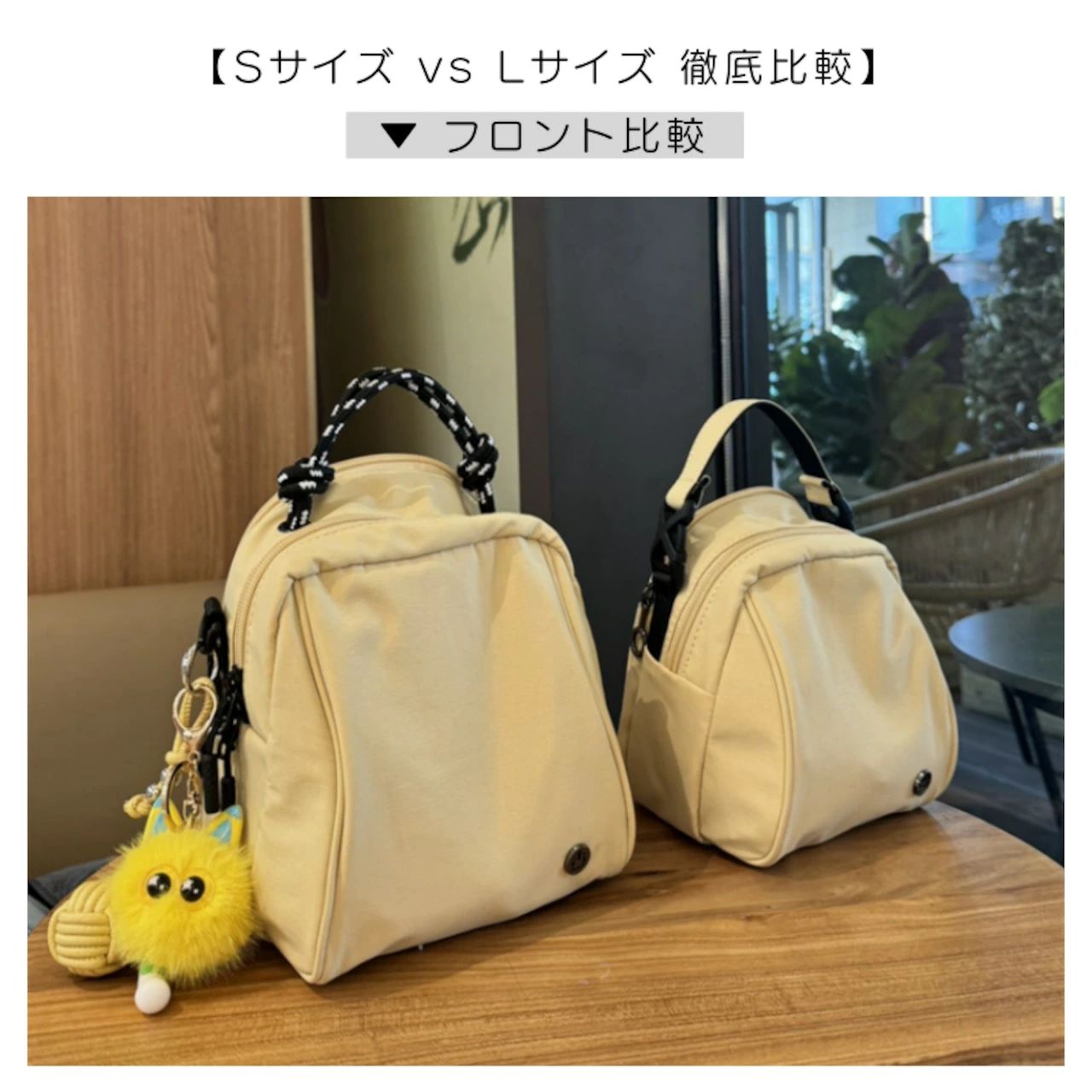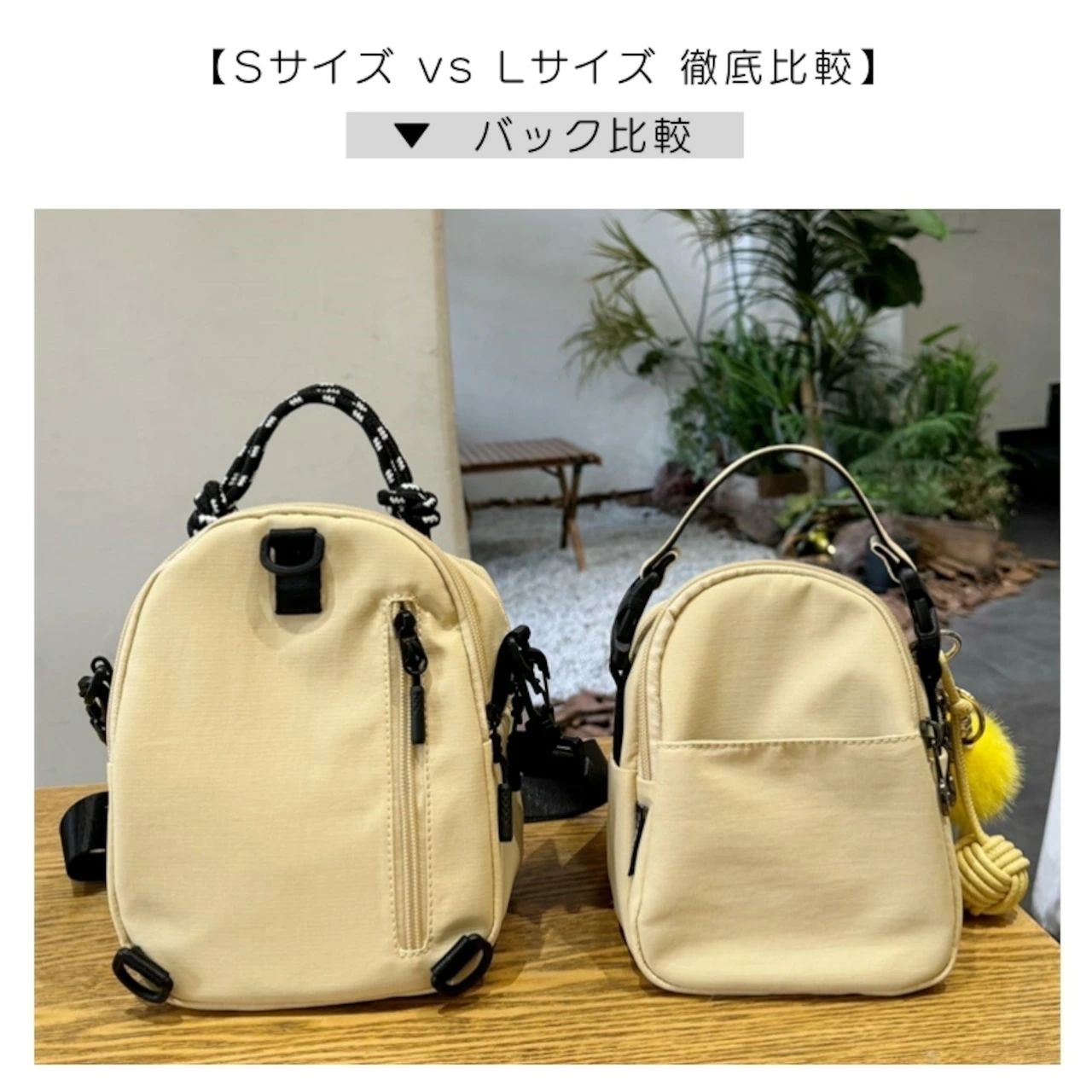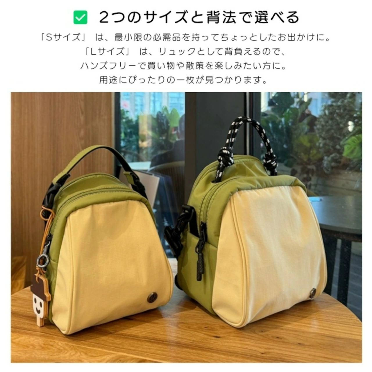「Sサイズ」 は、最小限の必需品を持ってちょっとしたお出かけに。「Lサイズ」 は、リュックとして背負えるので、ハンズフリーで買い物や散策を楽しみたい方に。用途にぴったりの一枚が見つかります。