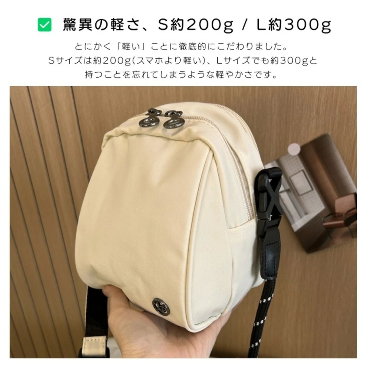 とにかく「軽い」ことに徹底的にこだわりました。Sサイズは約200g(スマホより軽い)、Lサイズでも約300gと、持つことを忘れてしまうような軽やかさです。