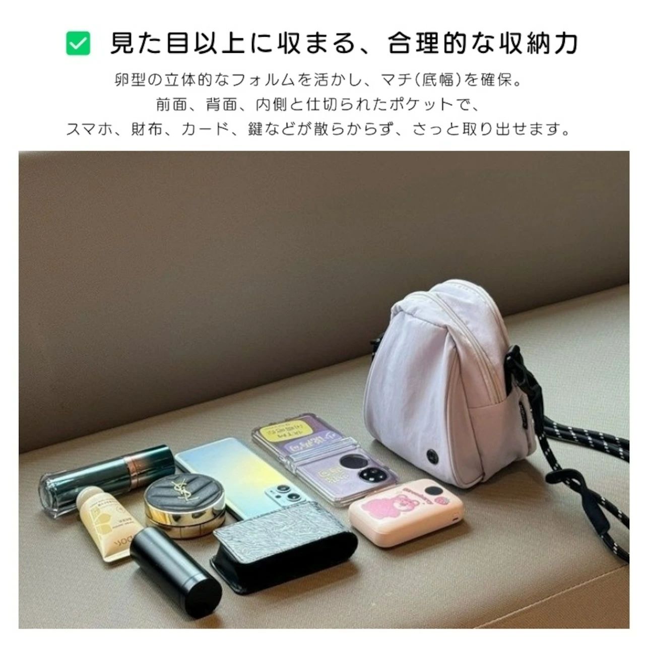 卵型の立体的なフォルムを活かし、マチ(底幅)を確保。スマホはもちろん、Sサイズでも折り畳み傘が、Lサイズでは小型の水筒や文庫本も収まる驚きの容量です。