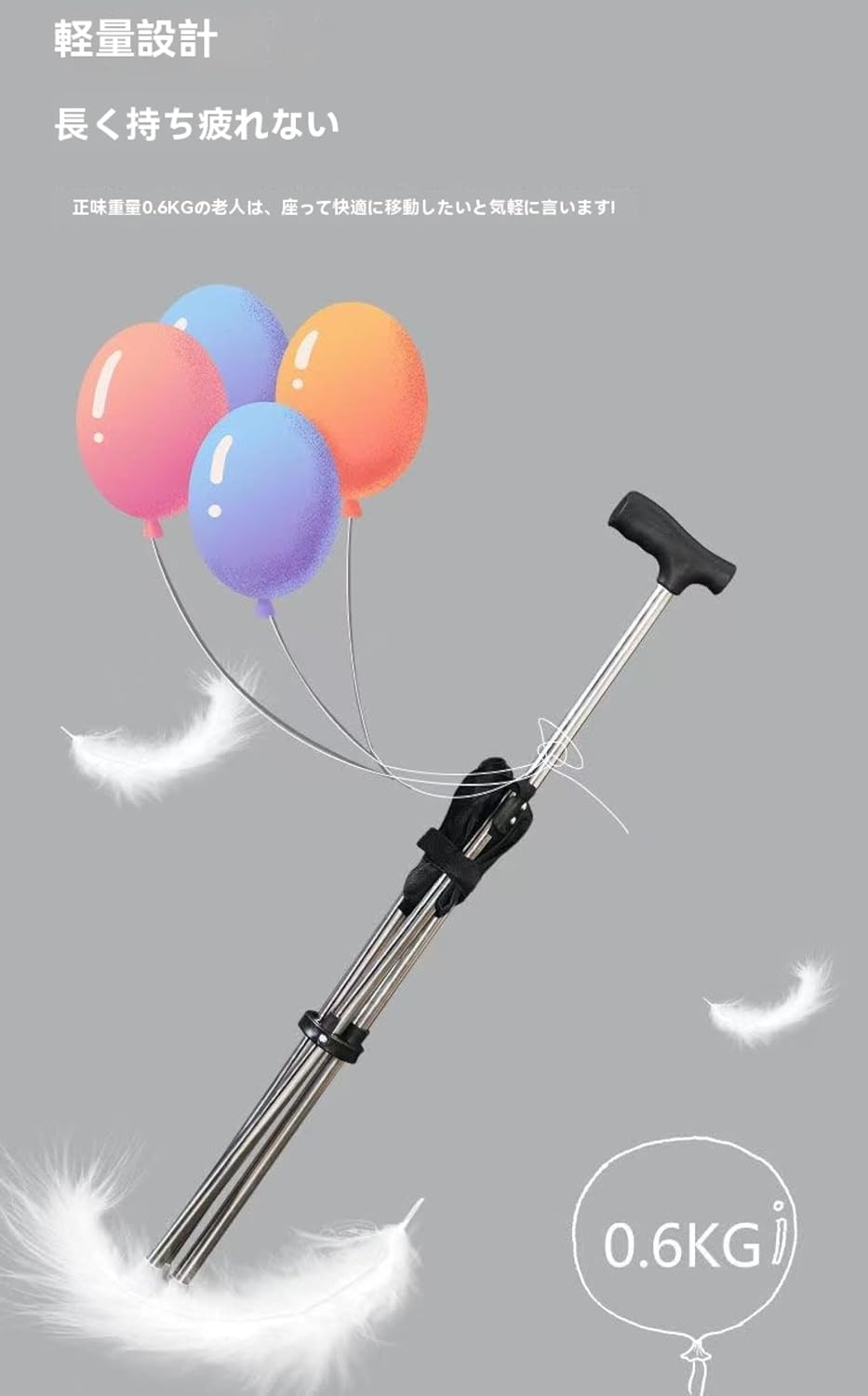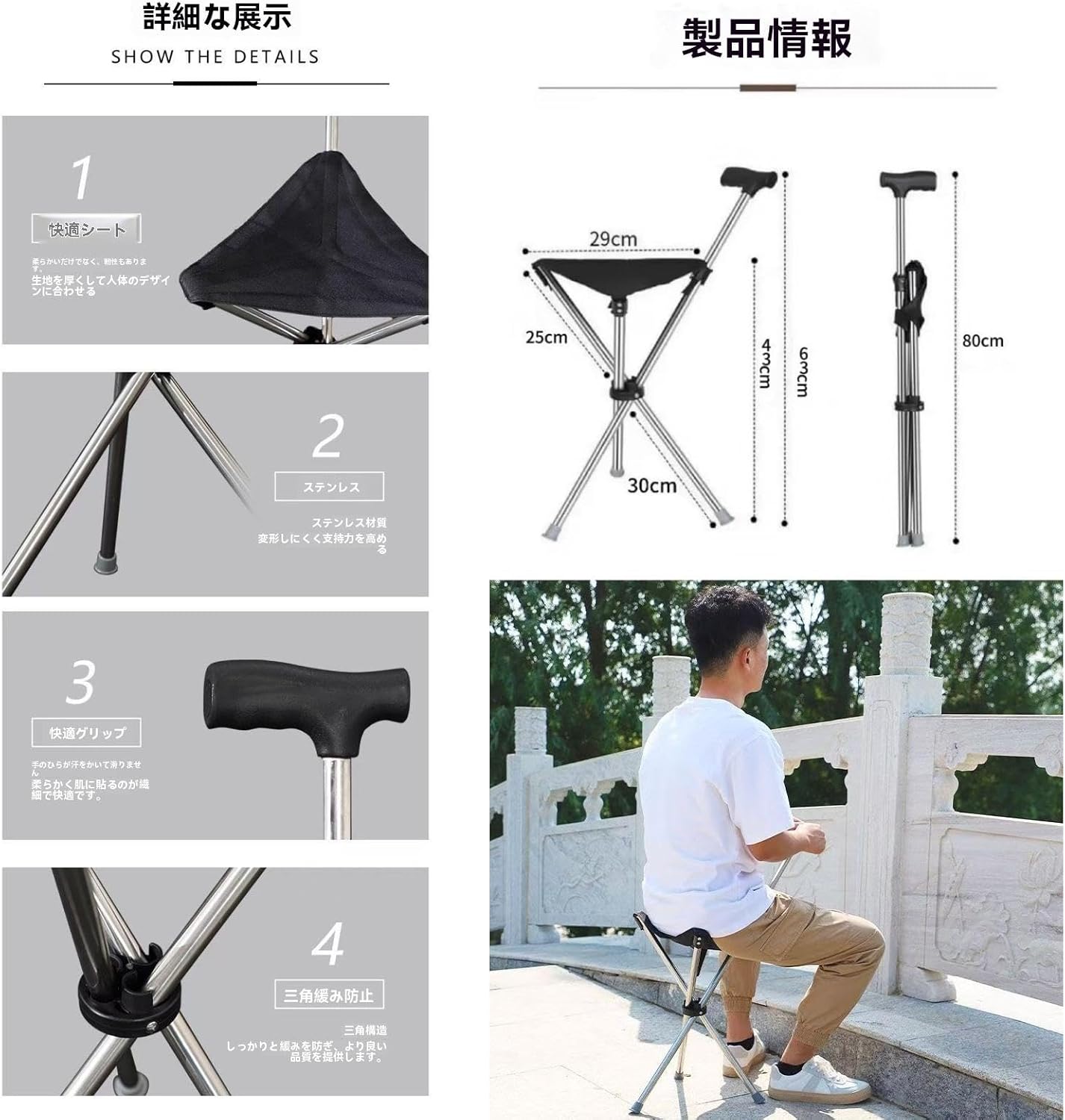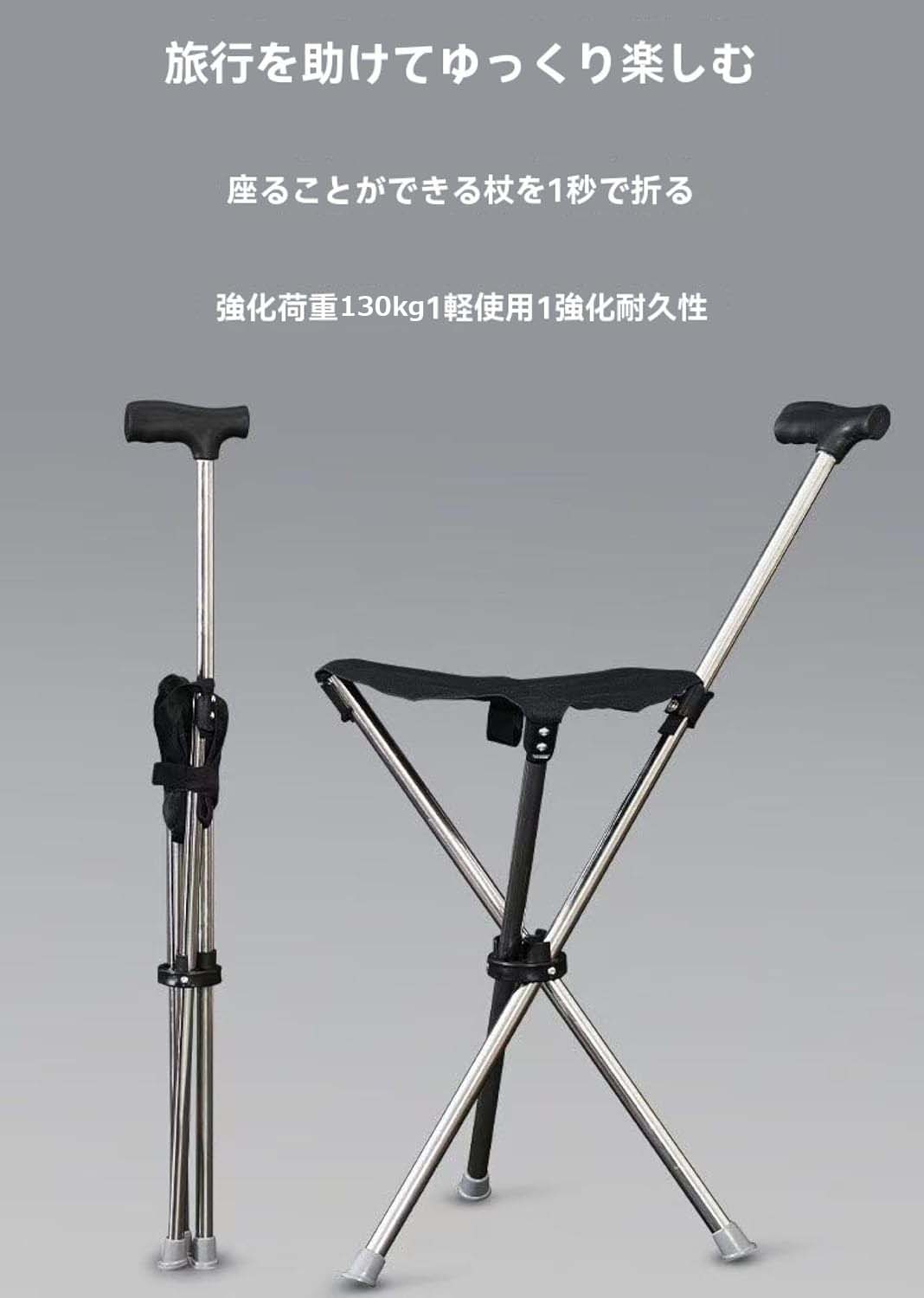折りたたみ式杖付き椅子 アルミ製 登山杖 歩行補助器 シート付き 休憩可能 荷重130kg 三脚設計 軽量で携帯性があり 収納が便利 折り畳み杖 杖椅子 座れる杖 座れるステッキ 折り畳み式ステッキ
