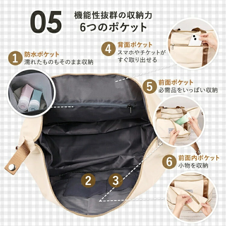 濡れたものもそのまま収納できる防水ポケットや、前面・背面・内側ポケットなど