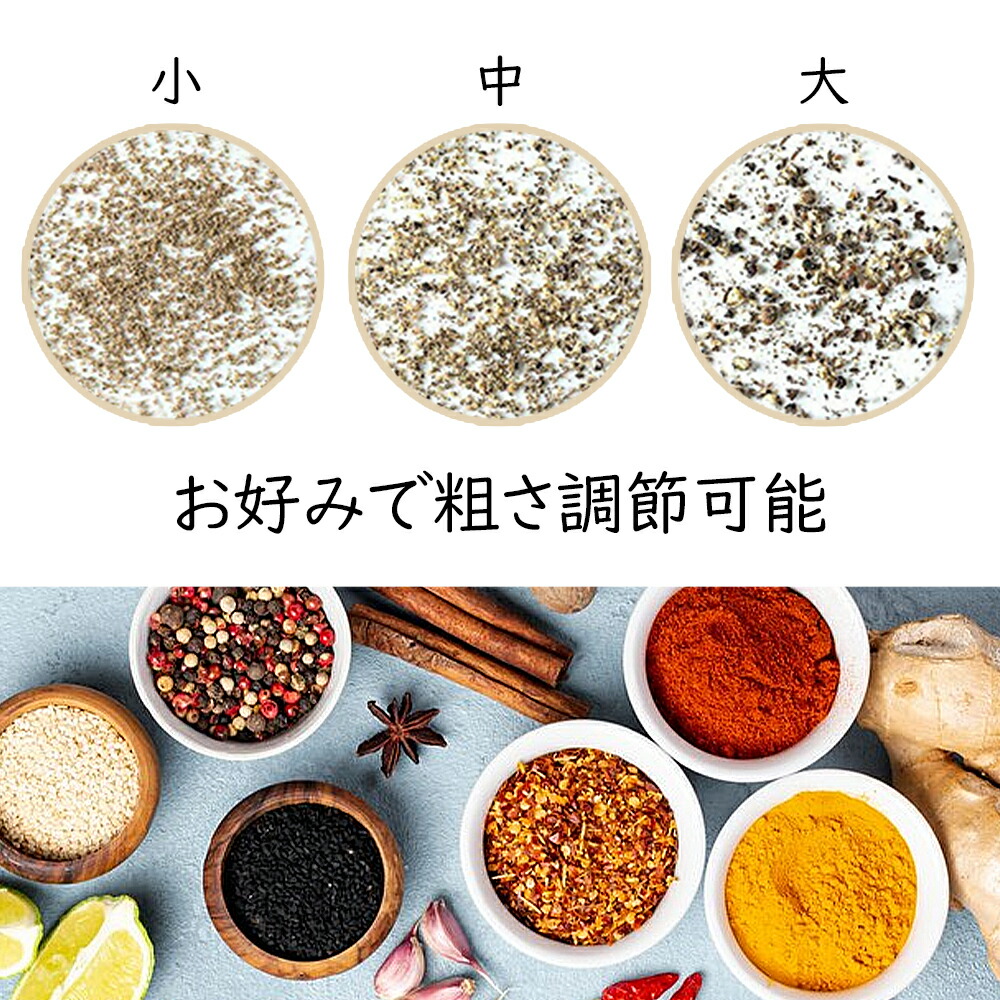ステンレス製のツマミを回して、簡単にお好みの粒度で挽くことができます。ツマミを時計回りに回すと粗くなり、逆に細かくなります。量の調整や粗さ調節があると、使い方のレパートリーが増えるので、ペッパーをさまざまな料理に取り入れることができます。