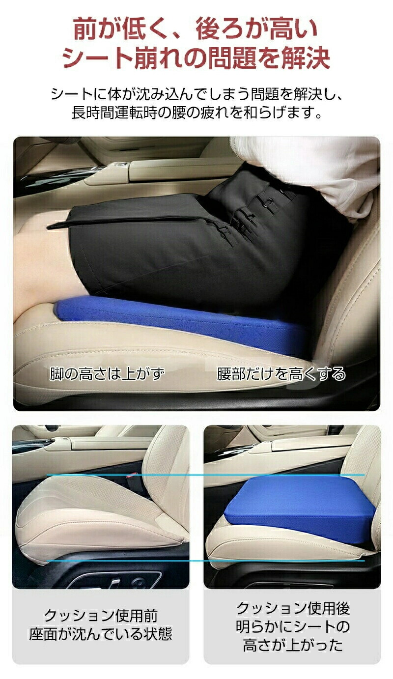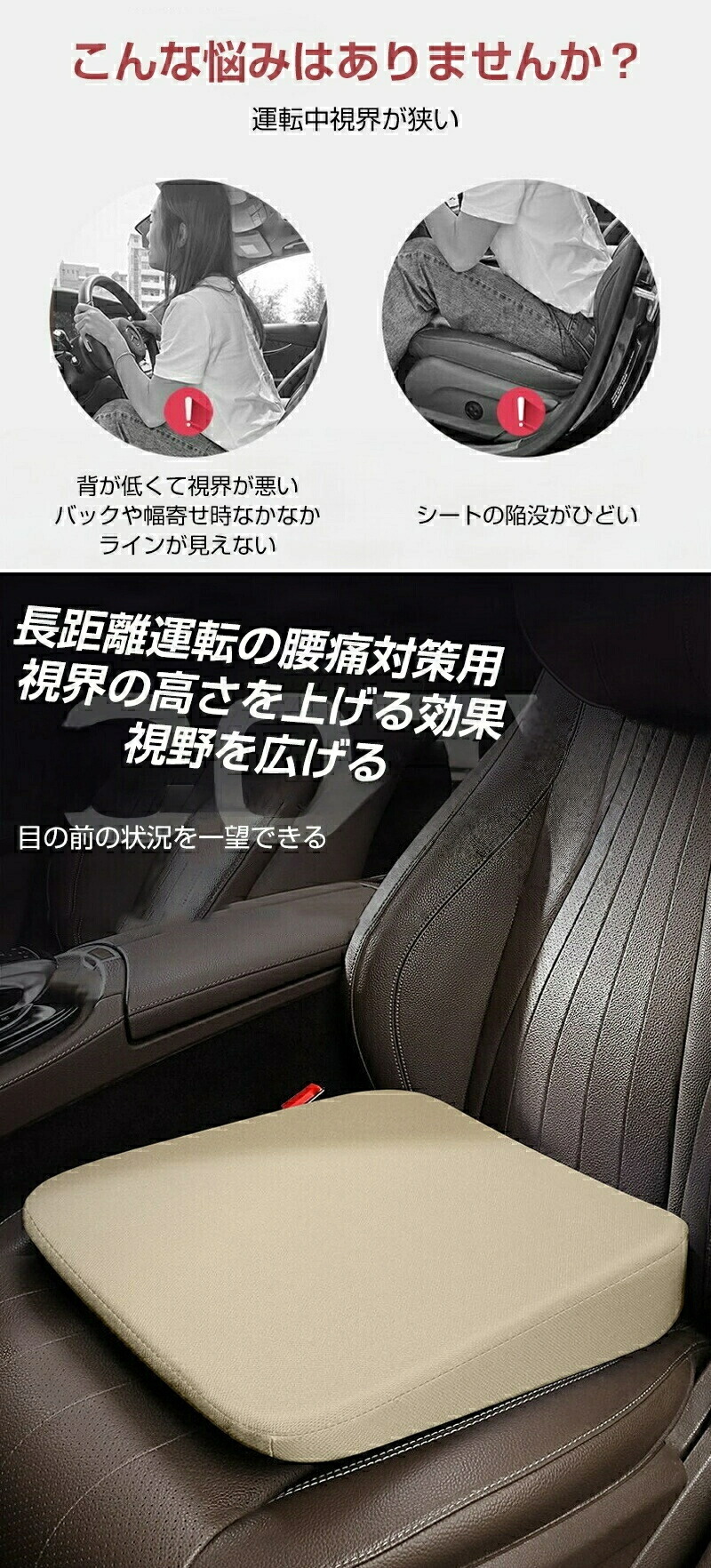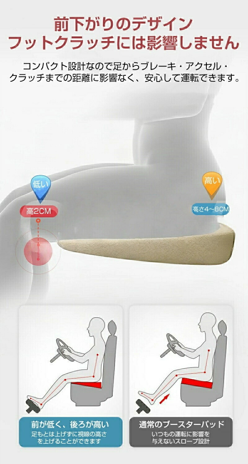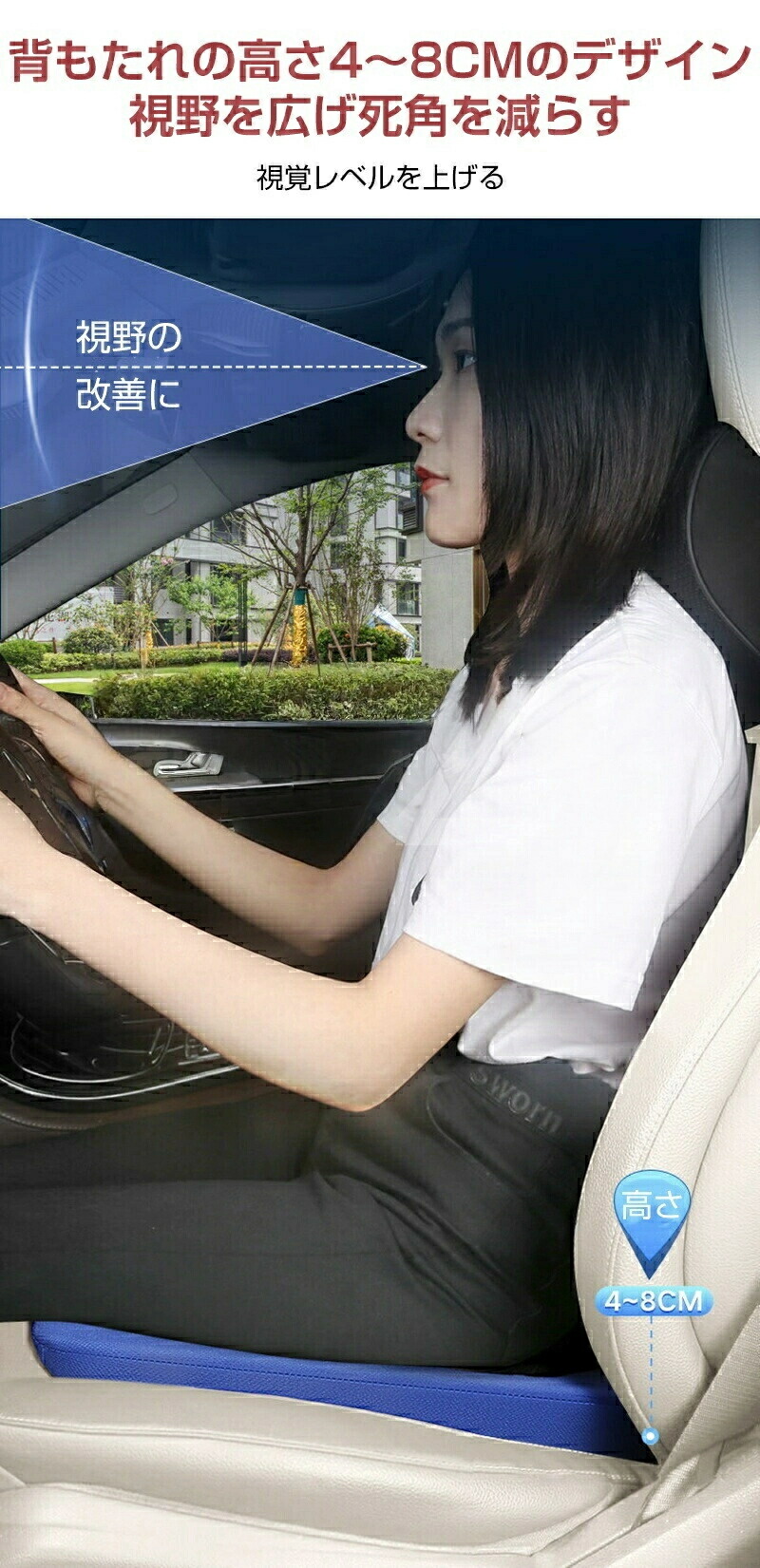 このクッションは、運転中の沈み込みを効果的に解消し、腰の位置を自然な形に改善します。約6cm~8cmの高さアップにより、視線も向上し、快適なドライビングをサポートします。身長の差を補正し、座席の問題を効果的に解決することで、脚のスペースにも影響を与えません。