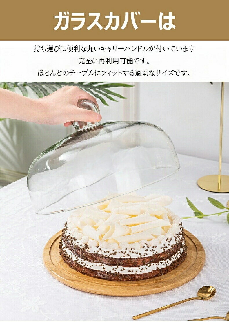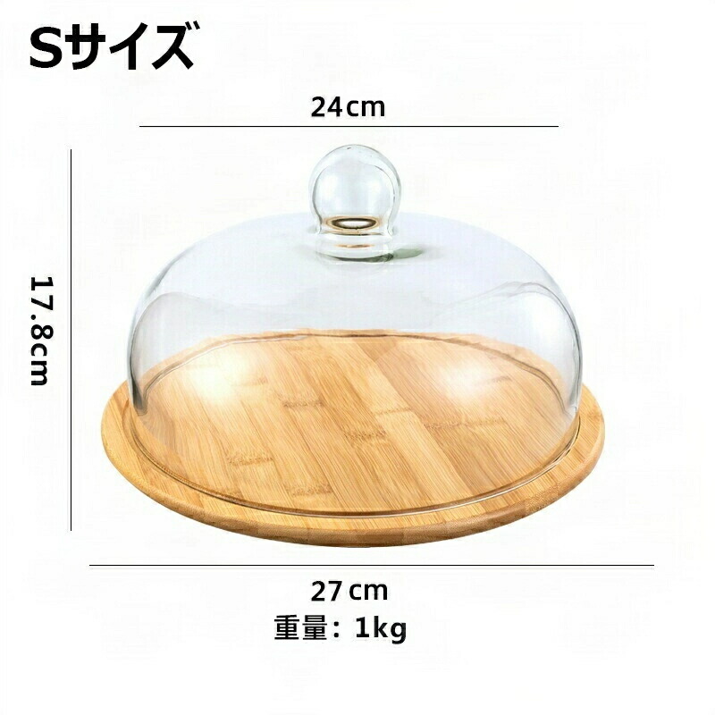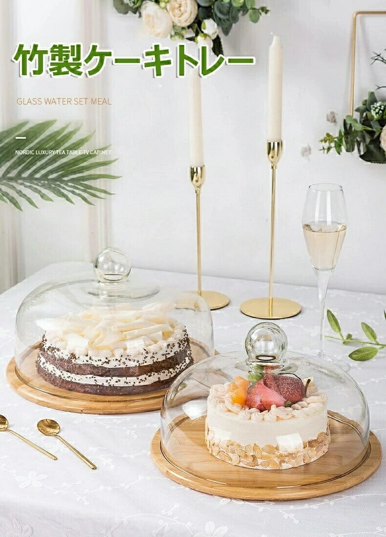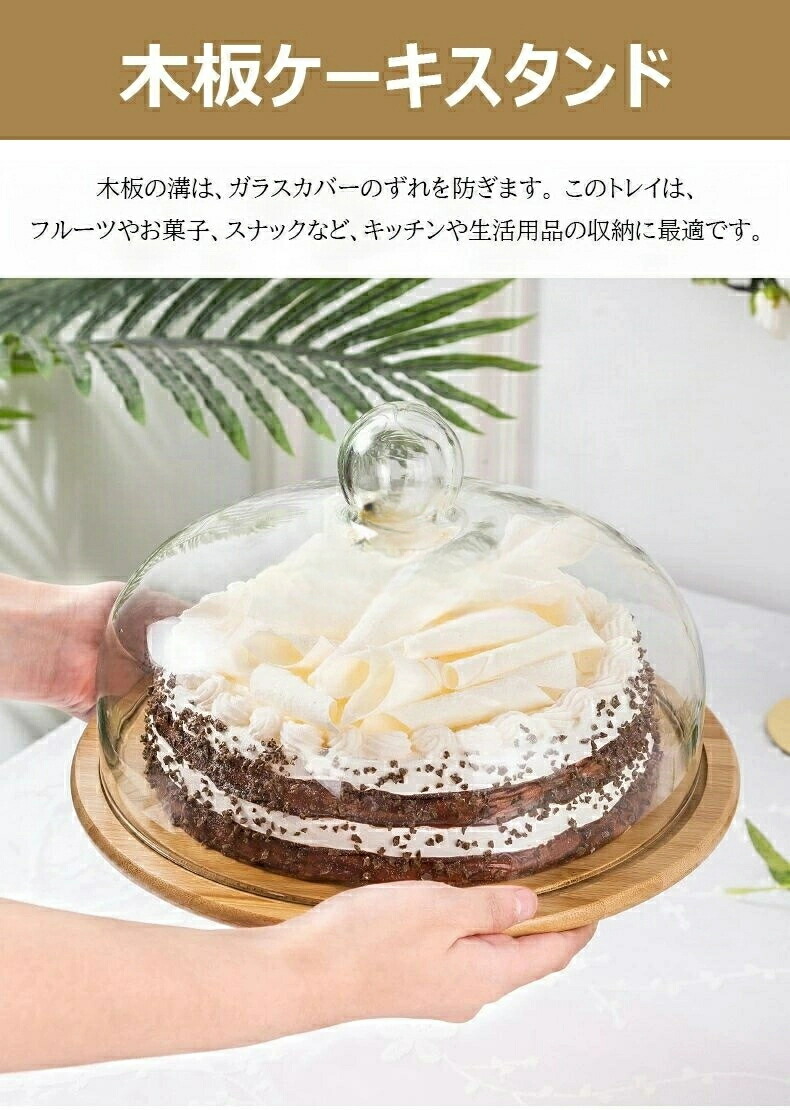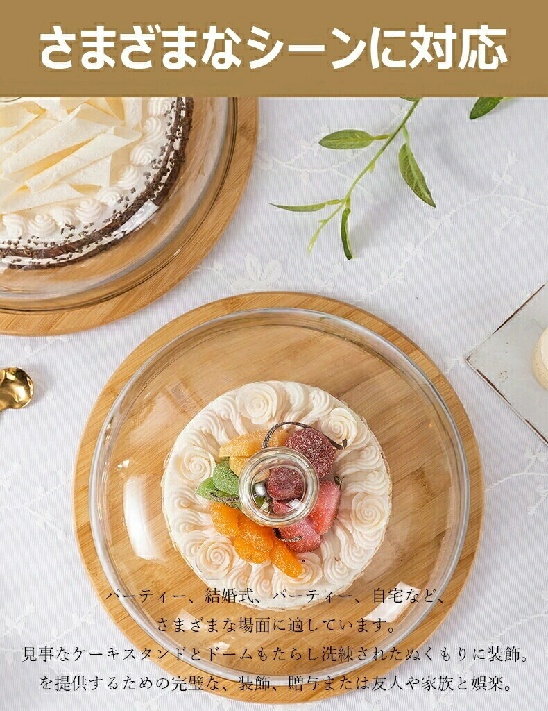 ガラスドーム ケーキカバー ケーキスタンド 蓋付き 果物 ガラス 竹製トレイ付き お菓子 デザート ケーキ スナック クッキー収納バスケット 誕生日 結婚式 パーティー ビュッフェ用 ブ 宴会テーブル