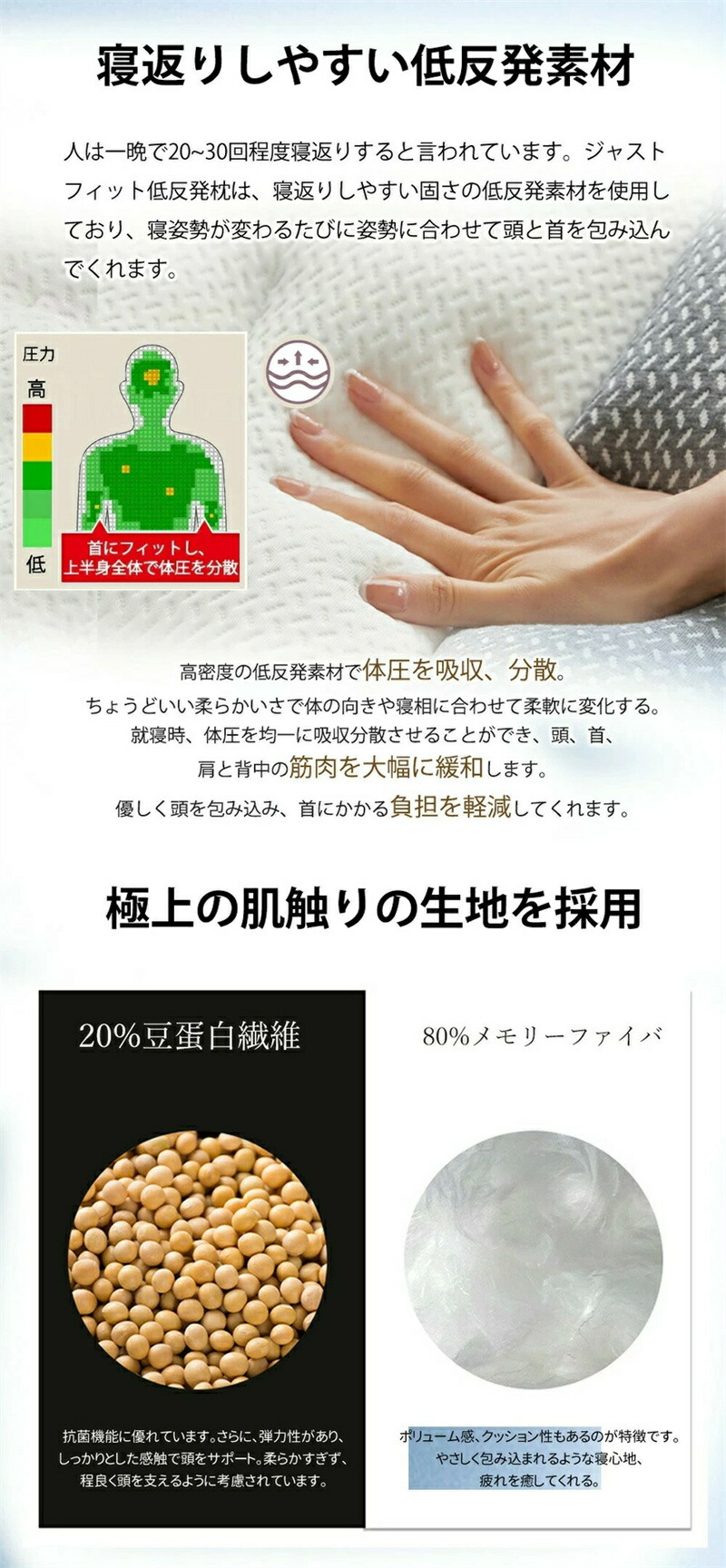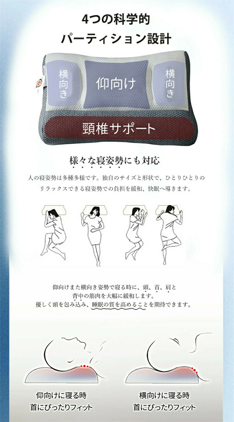 商品名 【SNS話題商品】 【肌触り抜群&洗濯可能な極上枕カバー】枕カバーは肌に優しく、ソフトで丈夫な素材生地を採用します。肌触りが抜群して、強い通気性を持つので長時間の横たわるでも蒸し暑くないです。枕カバー上のファスナーを開けてから簡単に外して洗濯できる。 【二方向で使える】突起部分を内側に向いて 寝る前30分、頸椎の曲度をストレッチ、自然に頸椎をストレッチ、元の曲度へ回復、突起部分を外向き 8時間深い睡眠へ、軸方向ストレッチ、一晩8時間快眠、曲度改善。