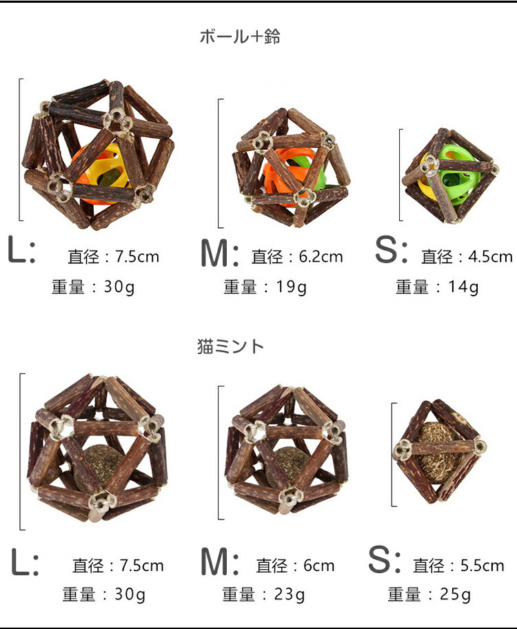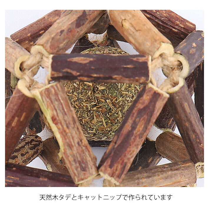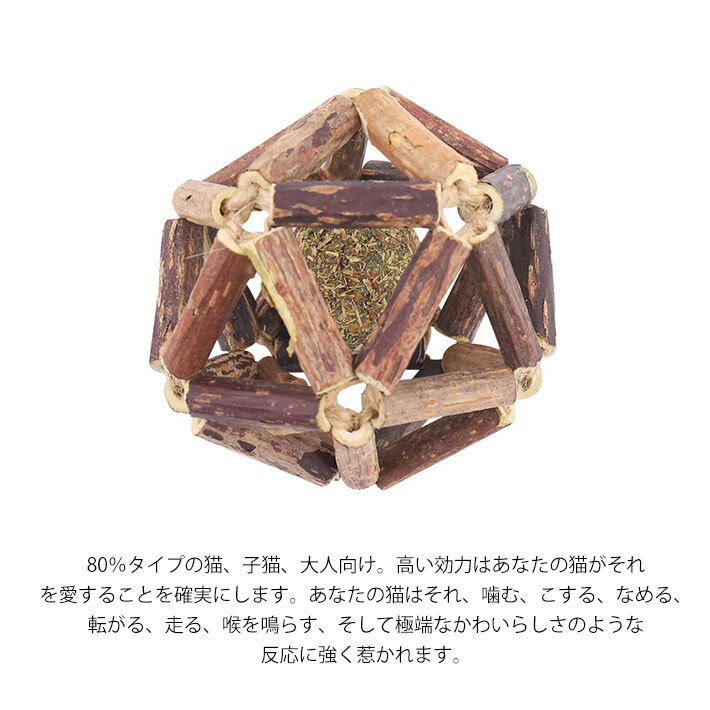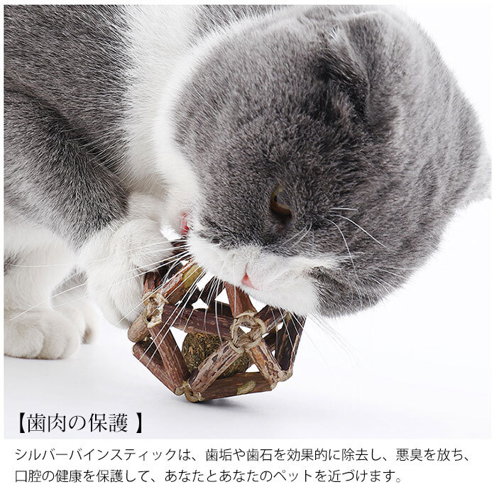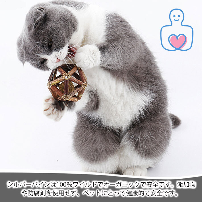 シルバーバインは100%ワイルドでオーガニックで安全です。添加物や防腐剤を使用せず、ペットにとって健康的で安全です。注:当社の製品は天然木タデとキャットニップで作られています。木の大きさのため、ボールのおもちゃも少しサイズが異なります。