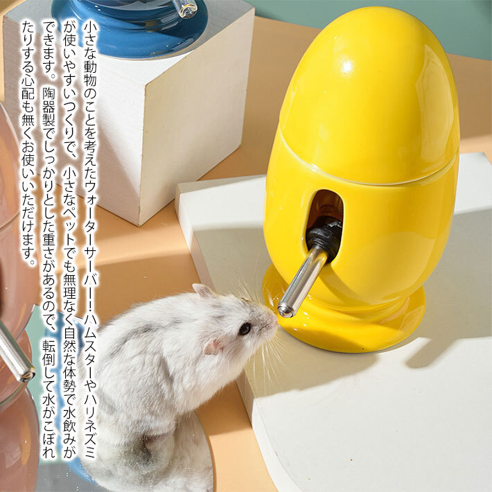 小さな動物のことを考えたウォーターサーバー!ハムスターやハリネズミが使いやすいつくりで、小さなペットでも無理なく自然な体勢で水飲みができます。陶器製でしっかりとした重さがあるので、転倒して水がこぼれたりする心配も無くお使いいただけます。