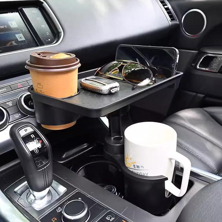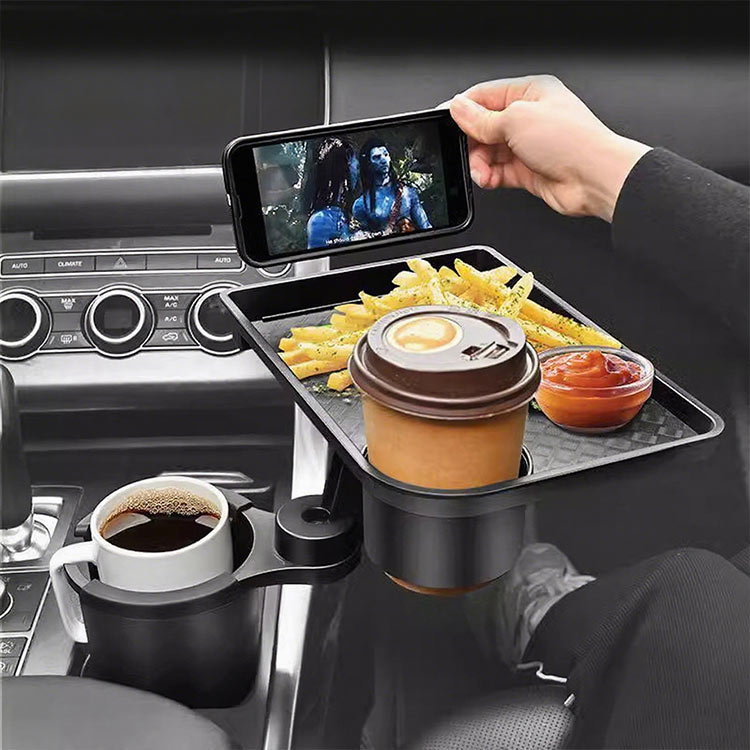 多機能 トレイ 2in1 カーテーブル 車用 車載 トレイ付き 小物置き 差し込み式 テーブル カップホルダー 車内 回転 ダブルカップホルダー スマホホルダー 食事 飲食 キャンプ ドリンクホルダー