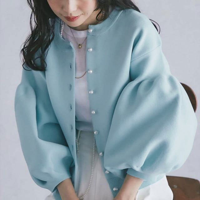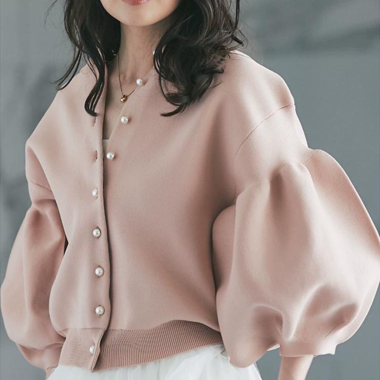 ニット 秋 レディース セーター ボリューム袖 ぽわん袖 きれいめ トップス 春 長袖 秋冬 ボタン クルーネック ゆったり フェイクパール カーディガン ジャケット 羽織 パフ 7分袖