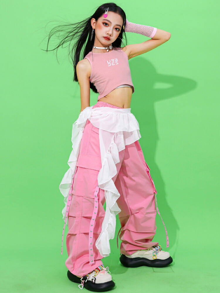 カーゴパンツ ピンク キッズ ダンス衣装 セットアップ チアダンス k-pop 衣装 女の子 トップス へそ出し ワイドパンツ ゆったり 腰巻き 韓国 アイドル ダンス 袖カバー