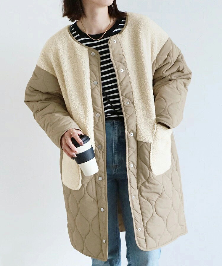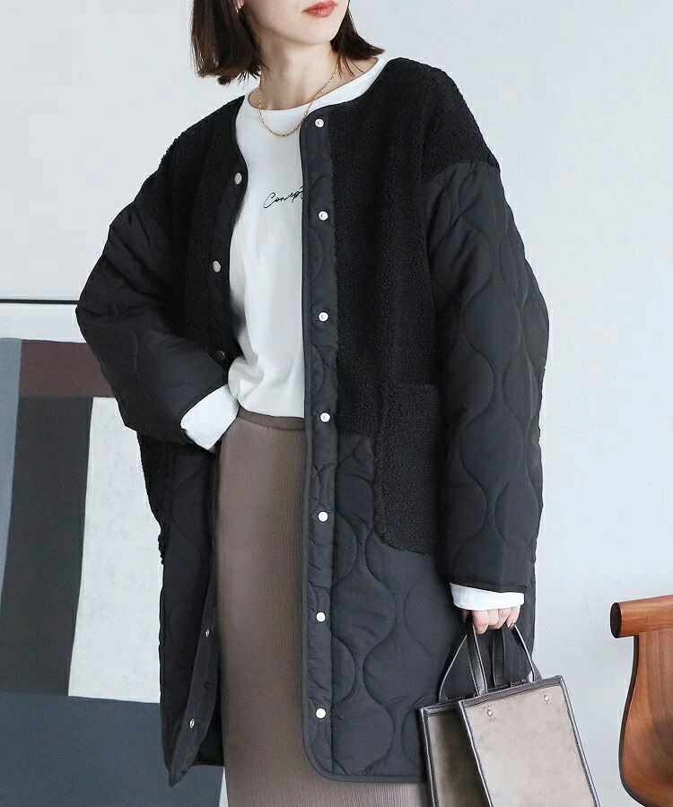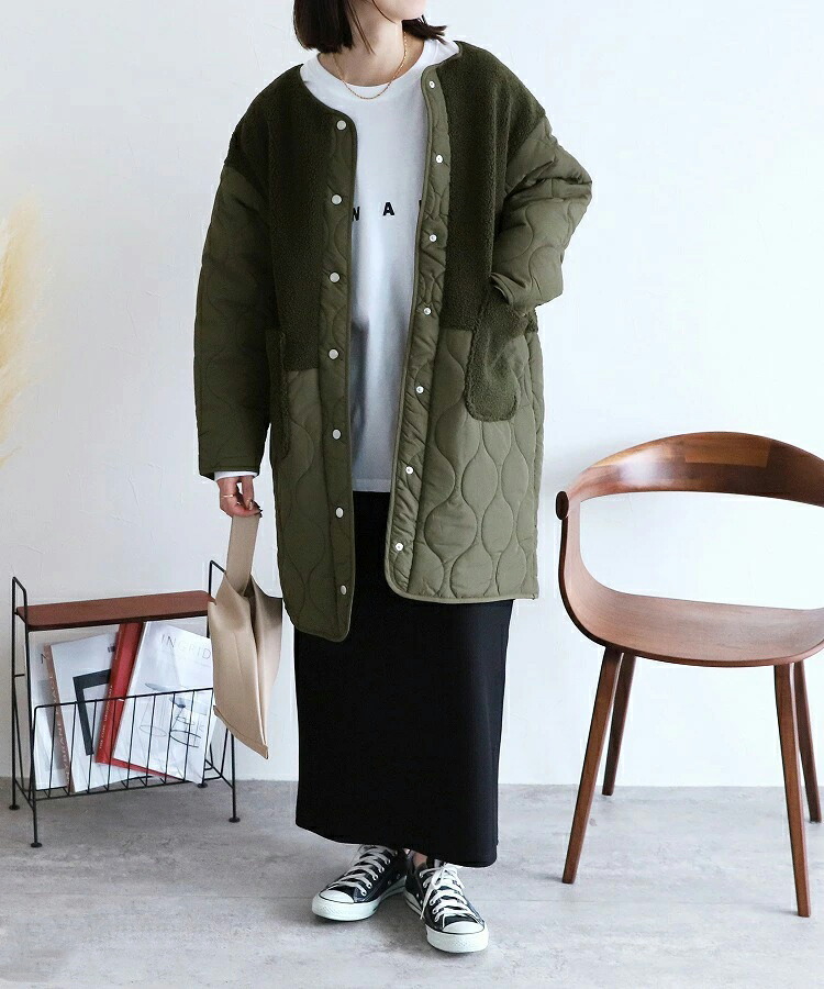 ノーカラーボア切替キルトコート アウタ レディースファッション 豊富な品揃え ブラック グリーン カーキ