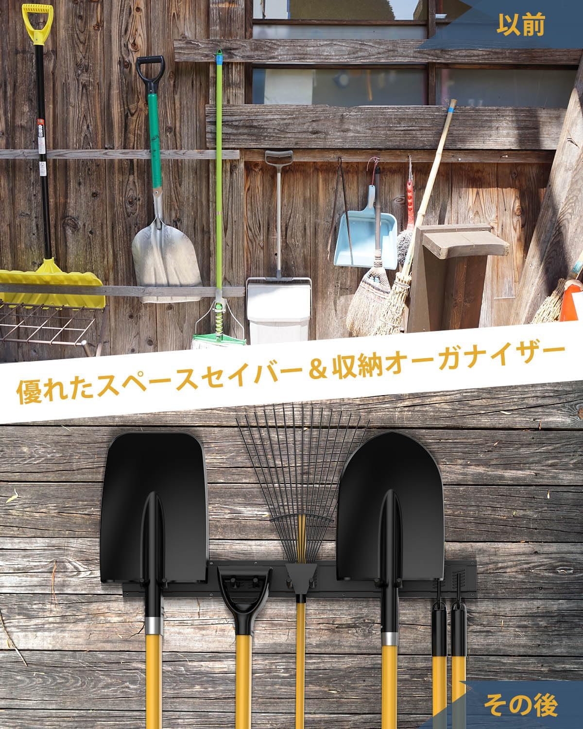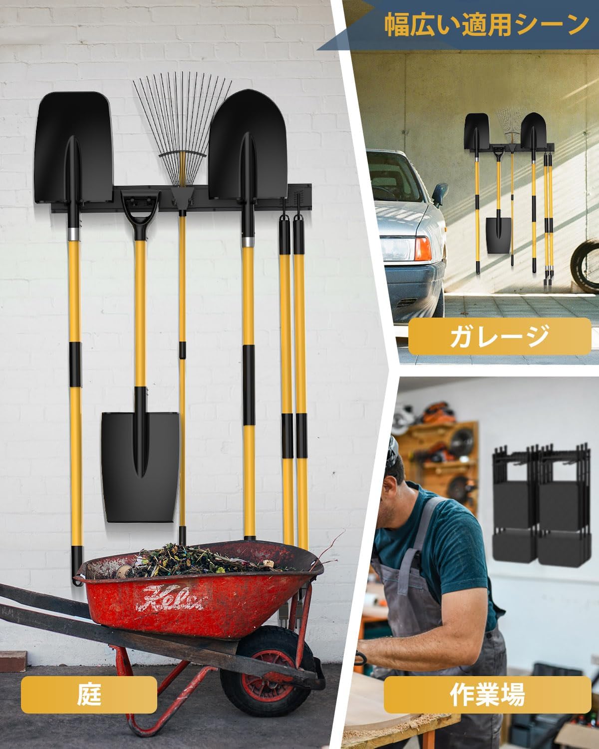 ガーデン壁掛けフック収納 ガレージツールオーガナイザー レーキ シャベルラック ガレージ用の頑丈なヤードツールオーガナイザー ガーデンツールオーガナイザー 壁マウント ガレージツール ストレージラック