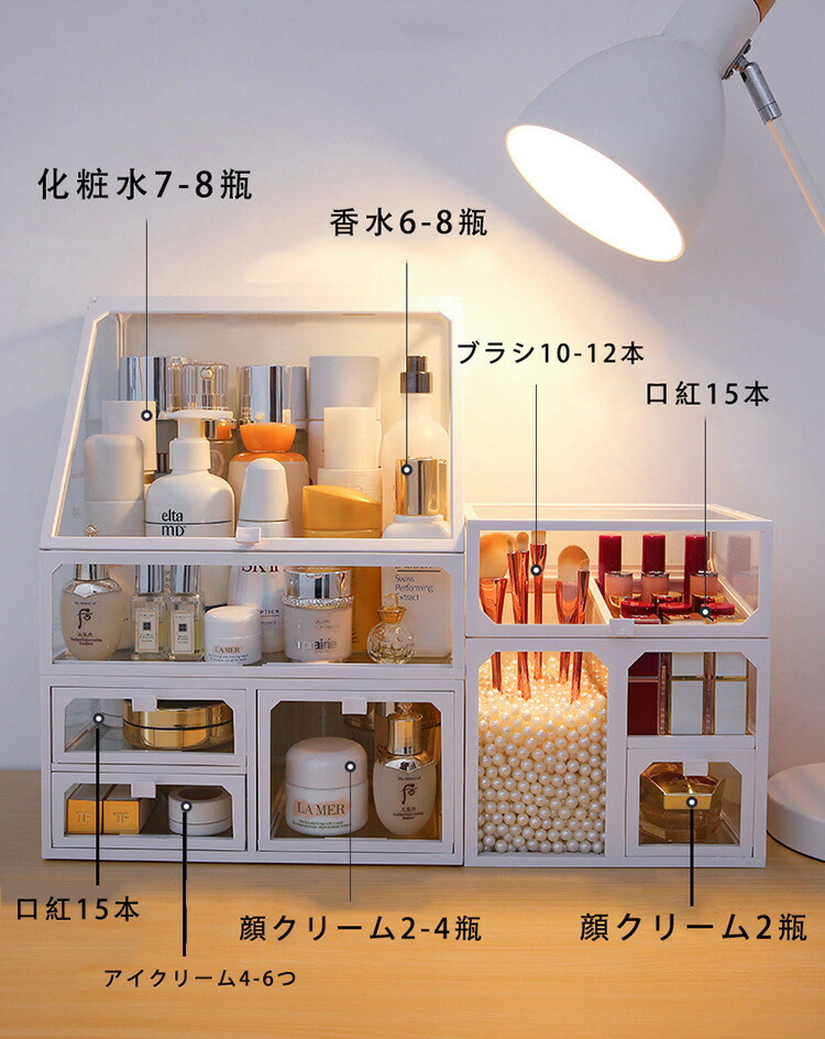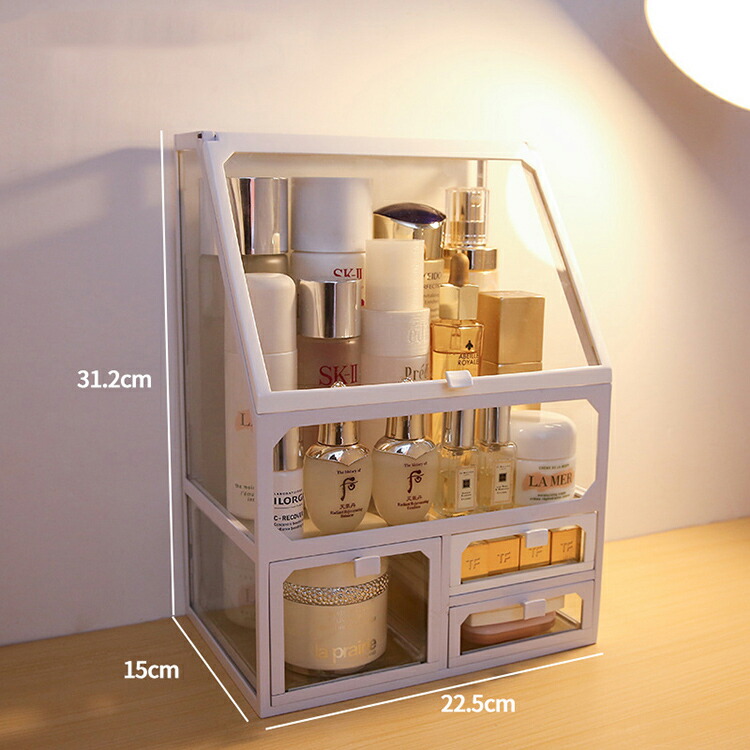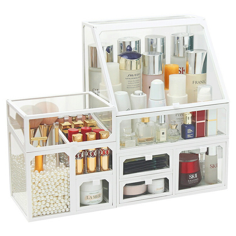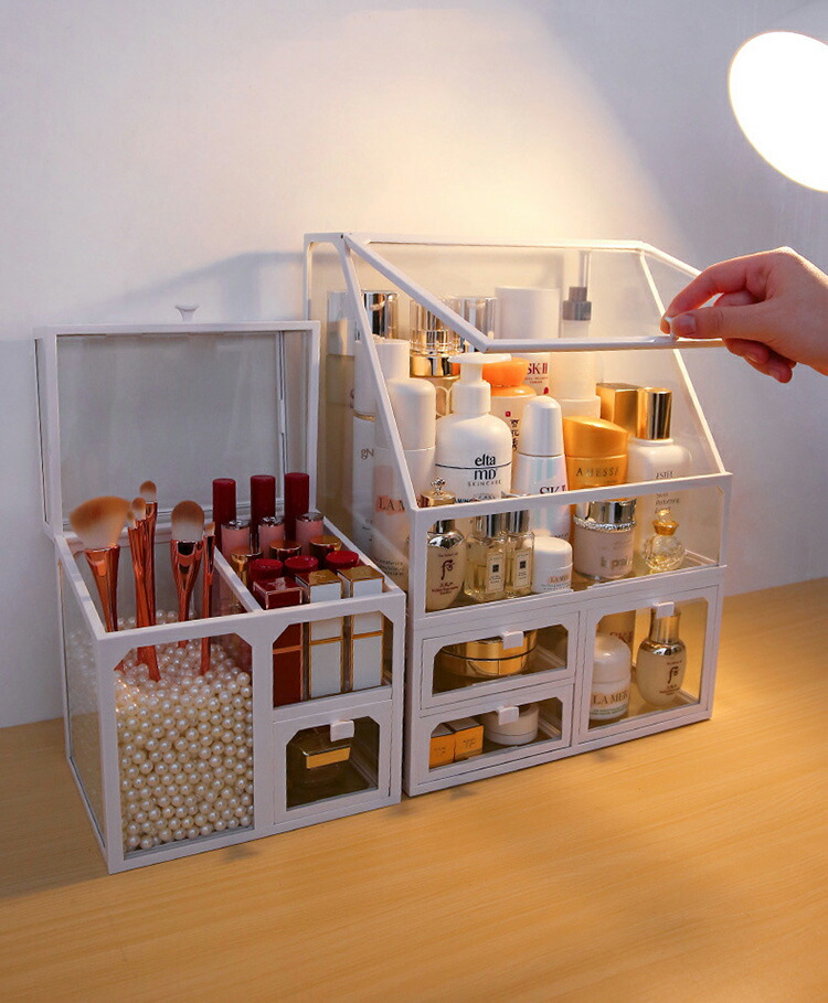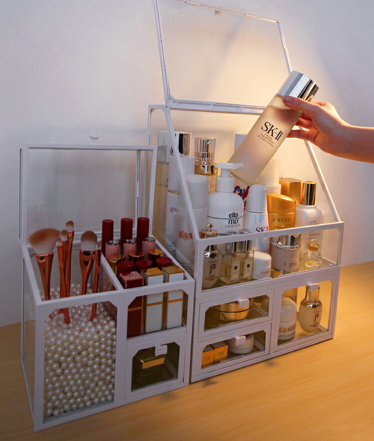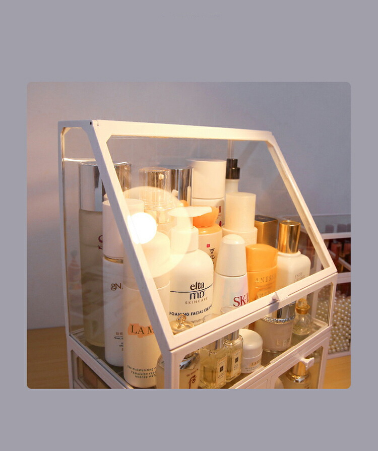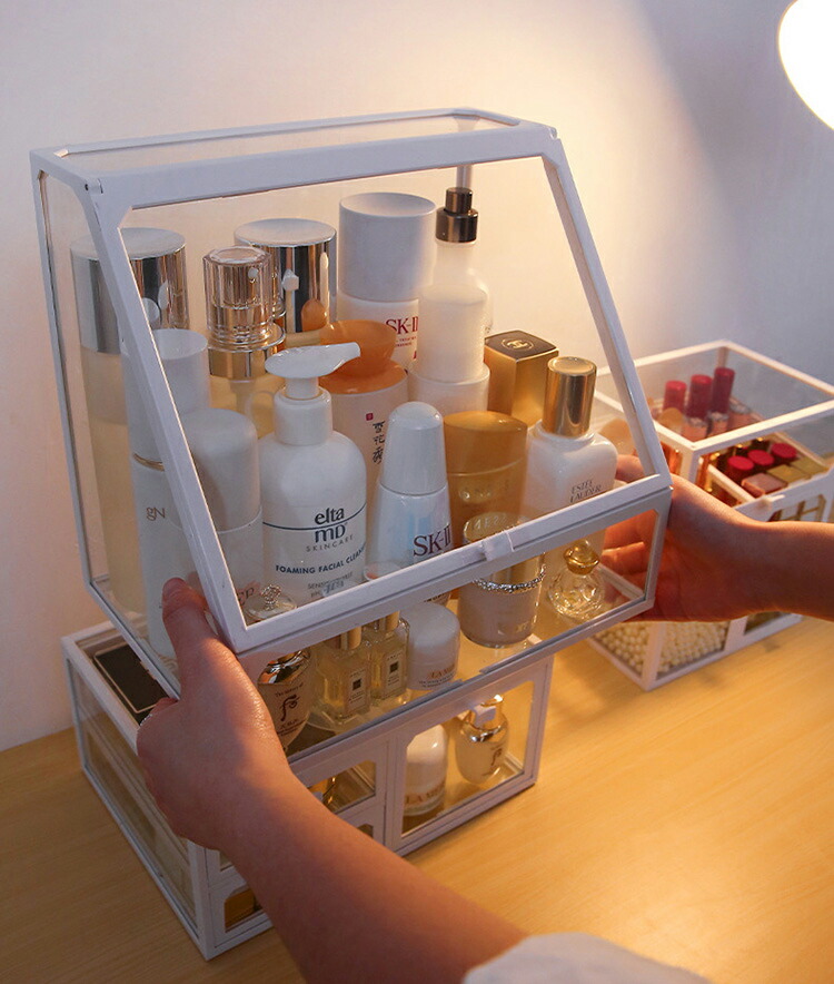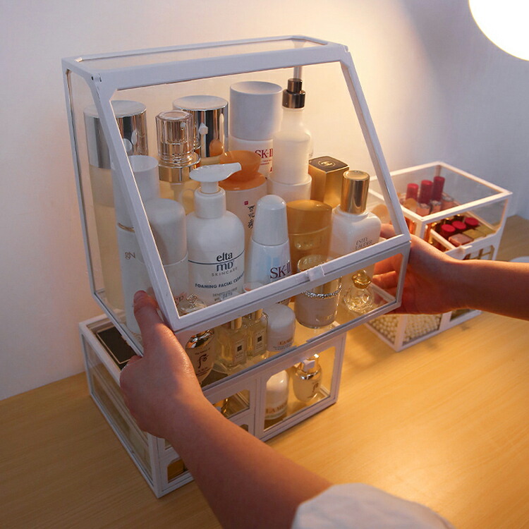 メイクボックス コスメボックス 大容量 コスメ収納 透明 蓋付き 化粧品 収納 ボックス 積み重ね 強化ガラス製 引き出し 防水 防塵 化粧品ケース 卓上収納 小物入れ 組立不要