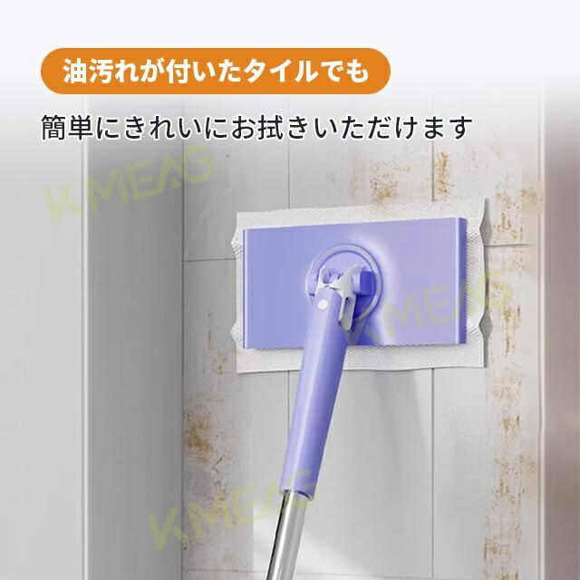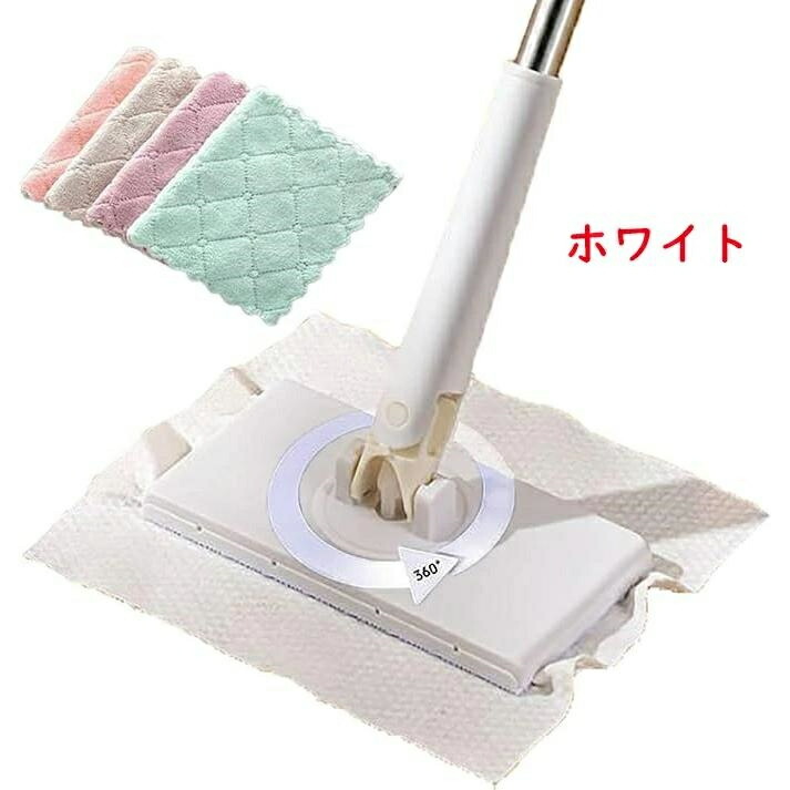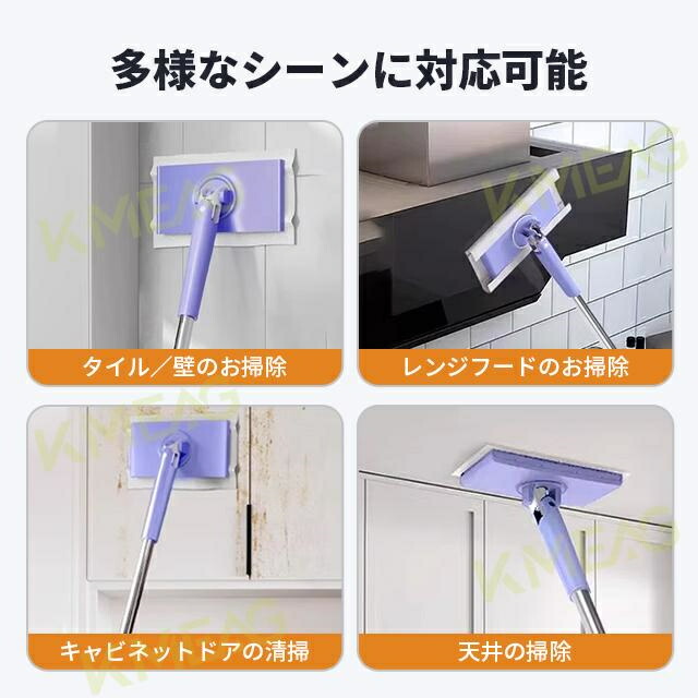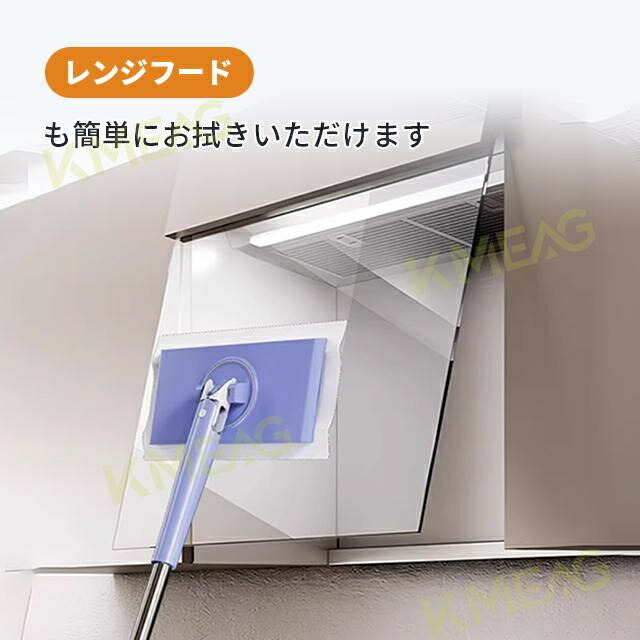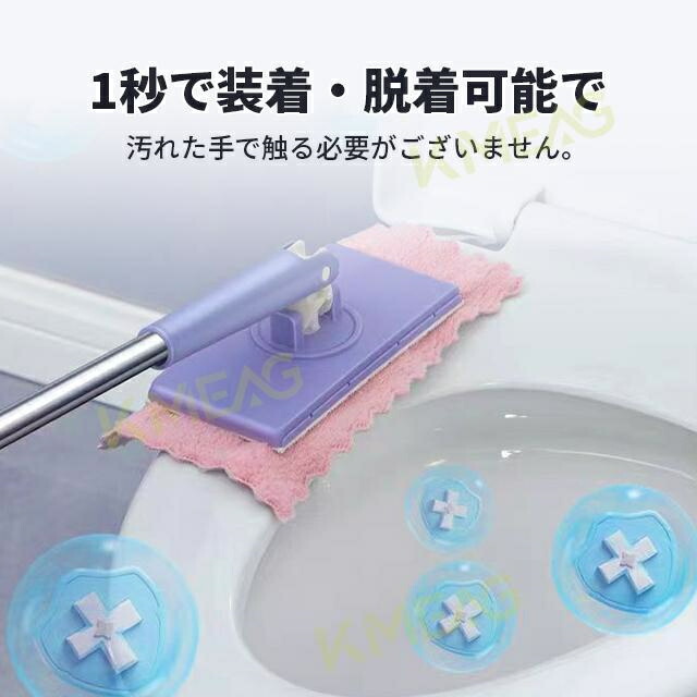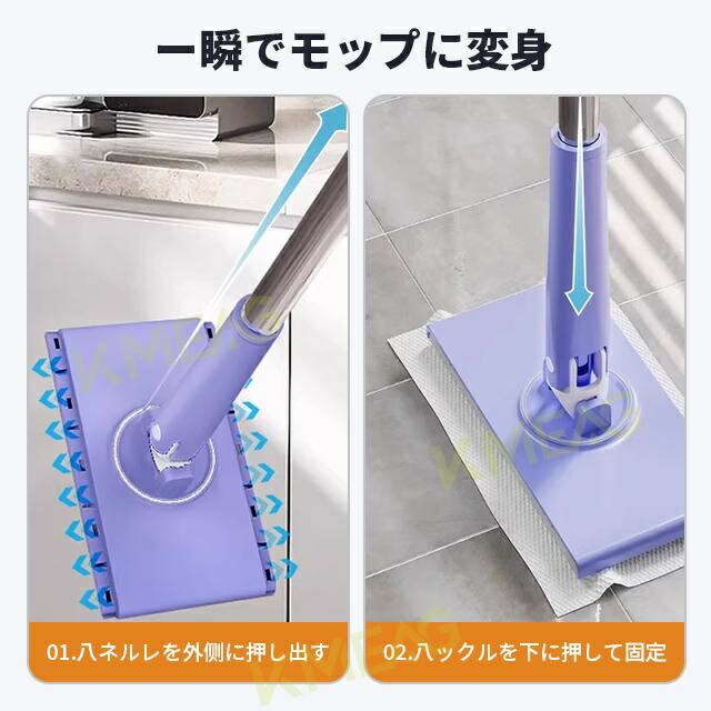 自動で雑巾を挟むモップ、クレンジングタオルが一瞬でモップに変身、手洗い不要/自動でシートを挟む/前後左右90°可動。ハンドルで軽く押す、1秒だけでクロスを挟める、従来の掃除方法を変える手を汚さず/接触しない/高所に使える、軽く回転させて、隅々まで清潔に。