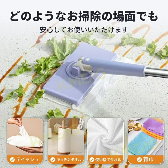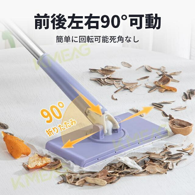 ペーパータオル掛けフローリングモップ、乾湿両用モップ/自動に挟めるデザインで、手を汚さない。前後左右90°可動で、ベッドの下、隙間、死角などを楽に掃除できる。