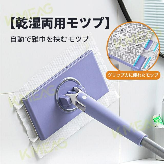 自動雑巾挟みモップ 乾湿両用 フローリングモップ 手洗い不要 ペーパータオル対応 床掃除 モップ 360°回転