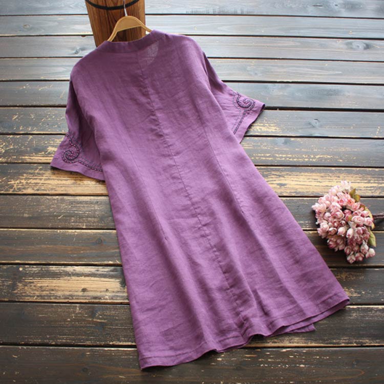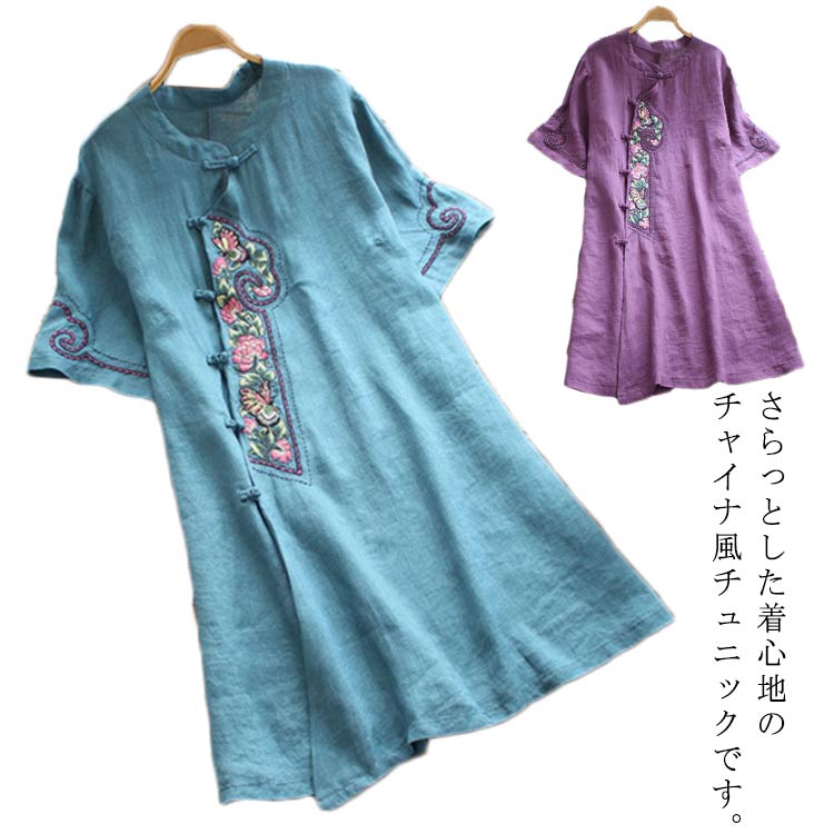 チャイナボタン ロング丈 コットンシャツ レディース 春 夏 トップス 半袖 ゆったり 大きいサイズ ビンテージ おしゃれ きれいめ 刺繡