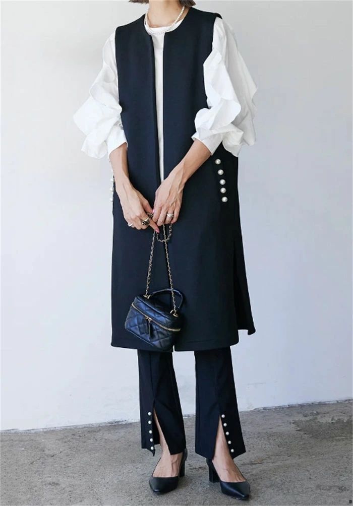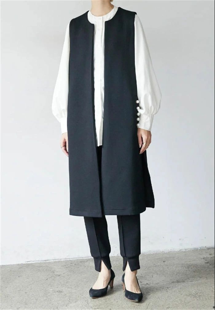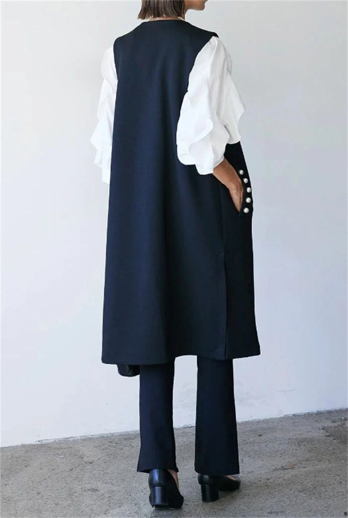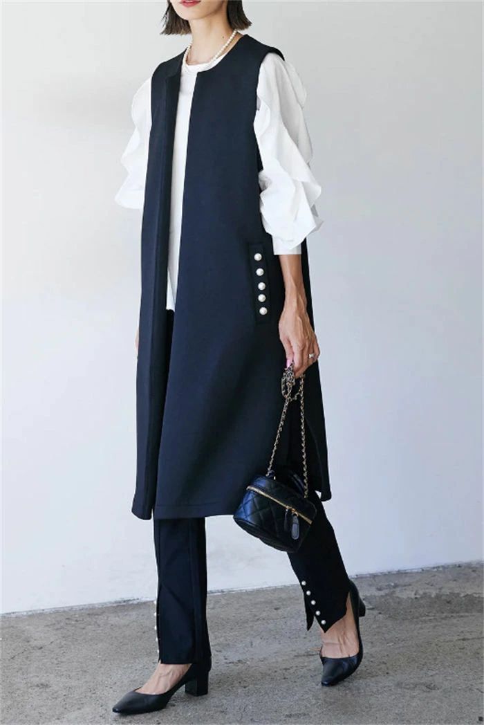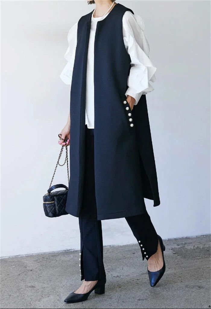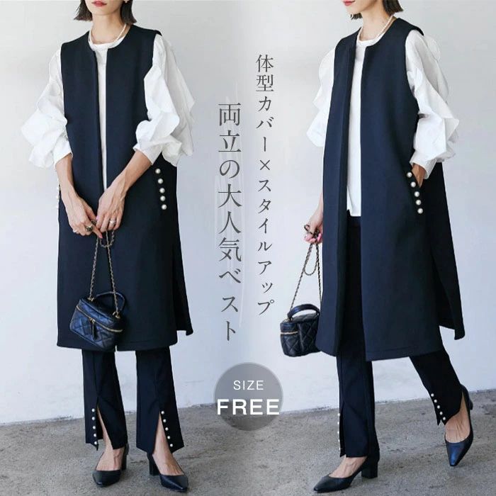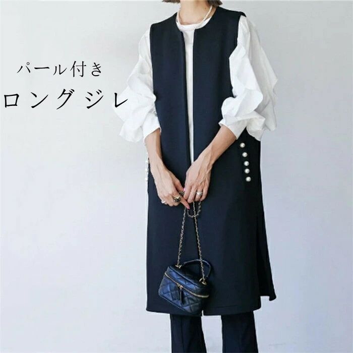 ジレ ベスト レディース フォーマル 春 秋 冬 ノースリーブ パール コート アウター ロングベスト ノーカラー 前開き 羽織 スーツ