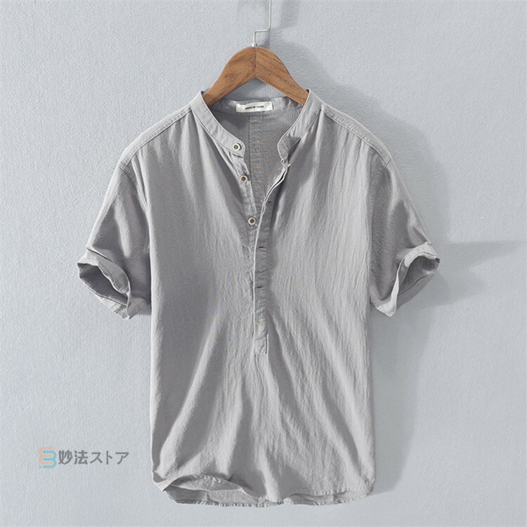 バンドカラーシャツ メンズ 綿麻 プルオーバーシャツ 半袖シャツ カジュアルシャツ ボタンシャツ