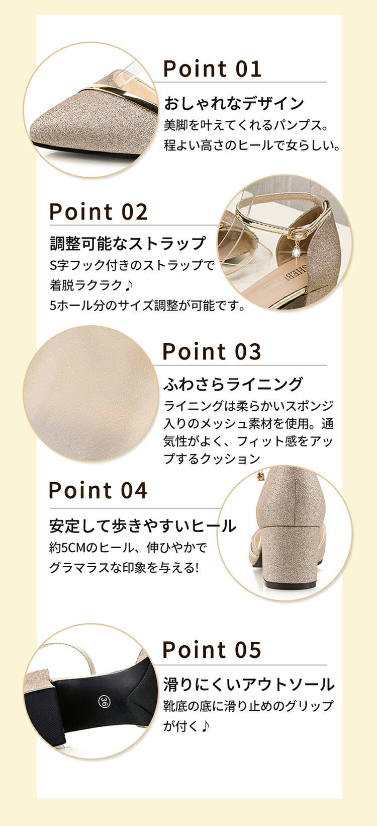 グリッター仕様がオトナ可愛いエレガントなパンプスが登場。つま先に斜めに入ったラインがアクセントになり、足元をスッキリとシャープに見せてくれます。美脚効果も期待できますよ。