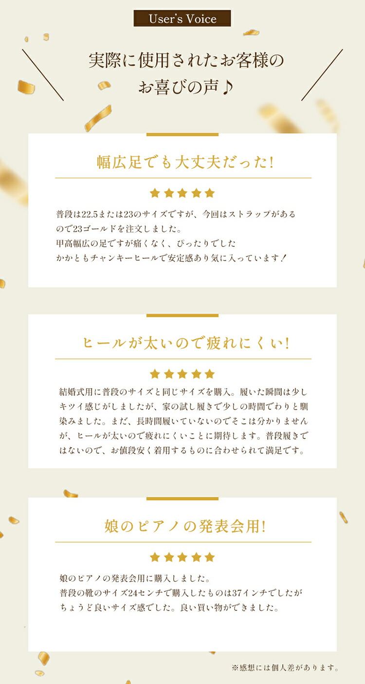 結婚式のお呼ばれやパーティー、卒業式や成人式、同窓会や謝恩会などのイベント、演奏会や発表会、デートや大事な記念日など、様々なオケージョンシーンでお使いいただけます。 ワンピースやドレスはもちろん、パンツスタイルにも合わせやすいです。ロング丈のスカートでも足の甲がさりげなく見えるので、抜け感があり足元が重たくならない