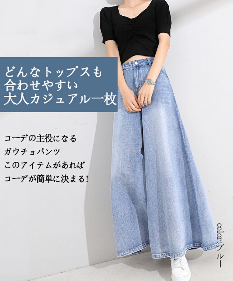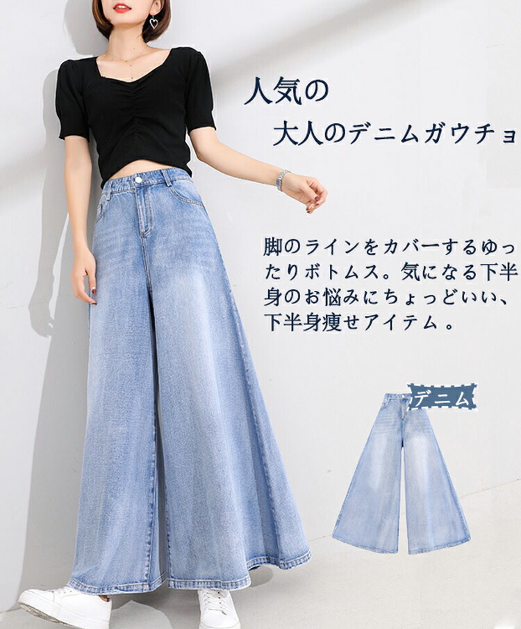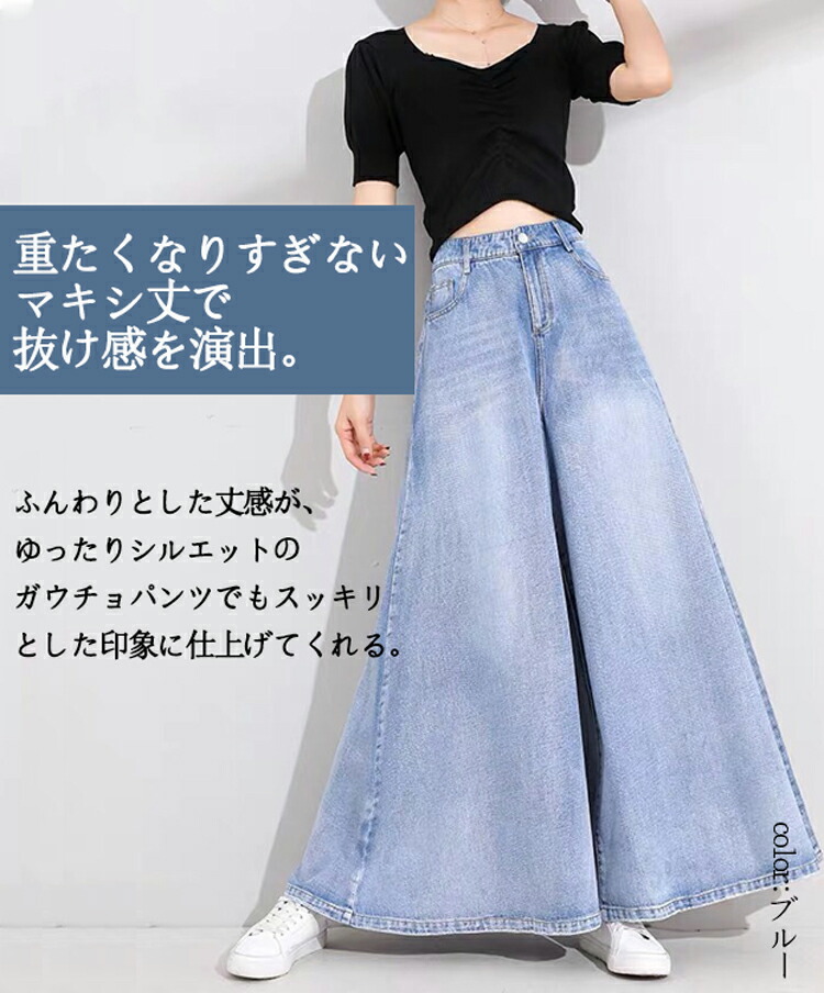 ワイドパンツ レディース デニム ガウチョパンツ 大きいサイズ ゆったり きれいめ デニムパンツ ワイド ふんわり ボリューム ロングパンツ 長ズボン カジュアル スカーチョ 揺れる 美 美シルエット