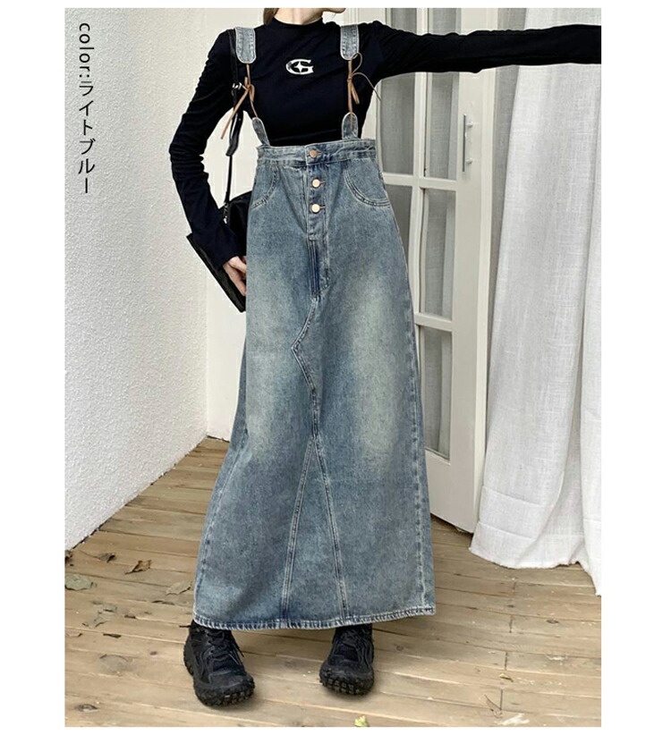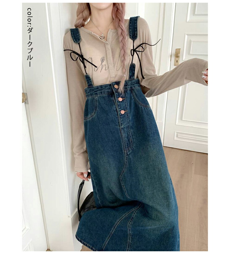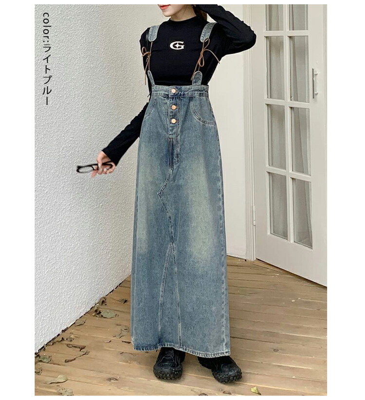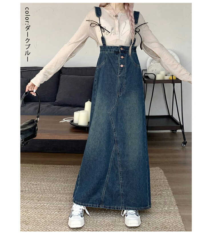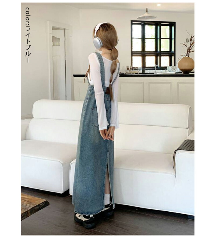 ロングワンピース レディース きれいめ ジャンパースカート デニム 大人 ワンピース 春 肩ひも 調整可 色落ち キャミソールワンピース マキシ丈ワンピース ロング ジャンスカ 春夏 ゆるめ スリット