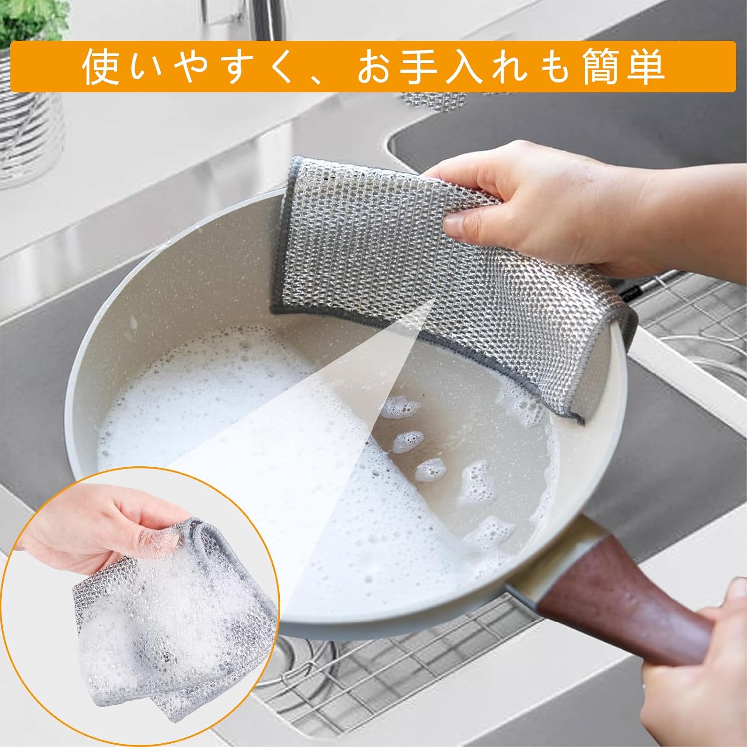 乾湿両用、使い勝手が良い、油汚れがくっつきにくいため、時短便利を叶う。細かい穴 泡立ちが良い、繰り返し利用可能、汚れがくっつきにくい、多機能 使いやすい、フライパンのコゲを残さずスッキリ落とす。