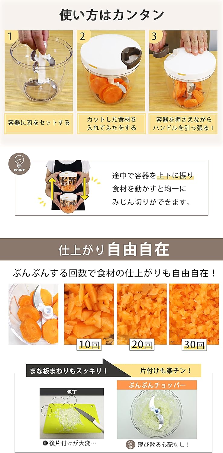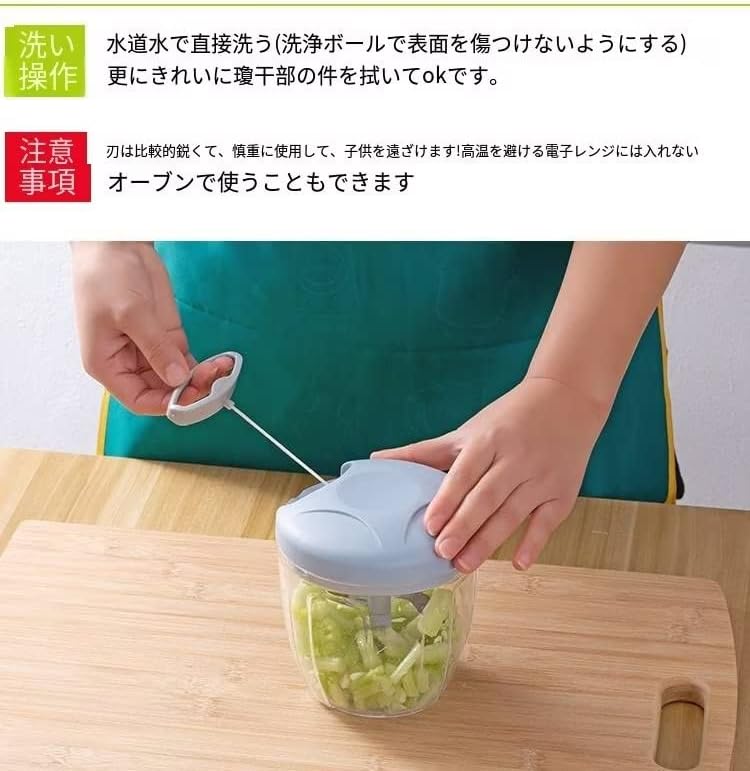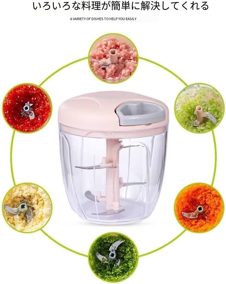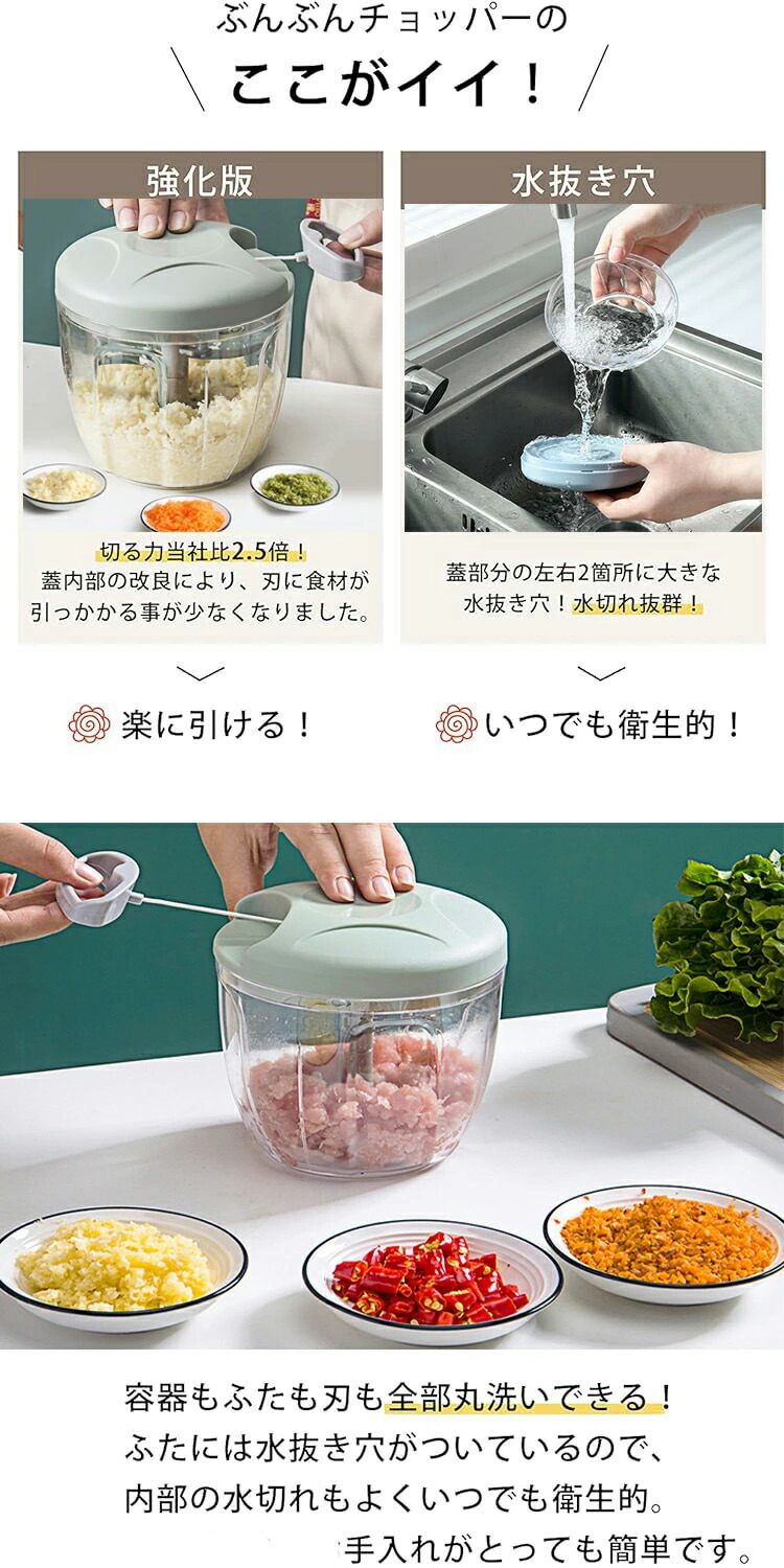 強化版 2.5倍 みじん切り器 900ml ふたも洗える フードチョッパー野菜 肉 水洗い可能 カットした野菜を入れてぶんぶん引っ張るだけでみじん切り チョッパー