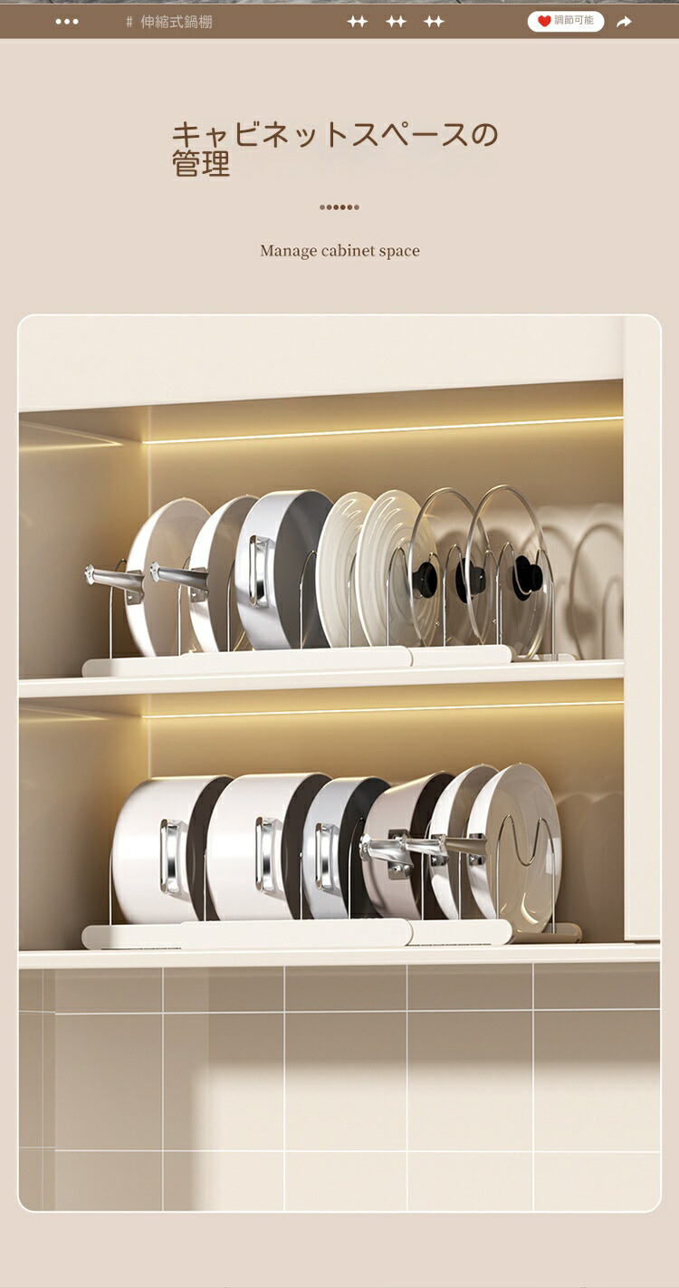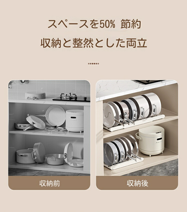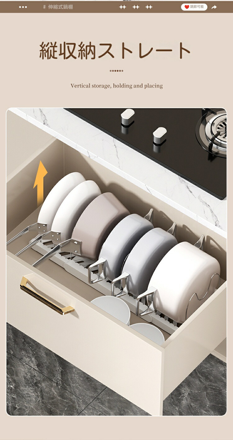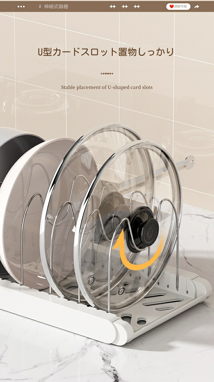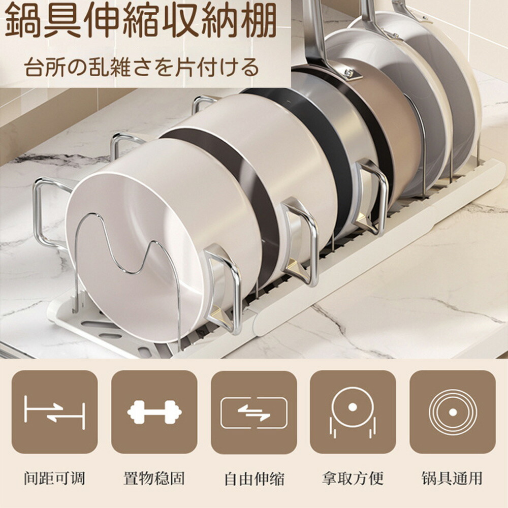 三段伸縮鍋収納棚 伸縮式 フライパンラック キッチン 鍋収納ラック フライパン 鍋 鍋蓋置き 6本仕切りパーツ付き まな板 鍋蓋スタンド 引き出し収納 鍋置き