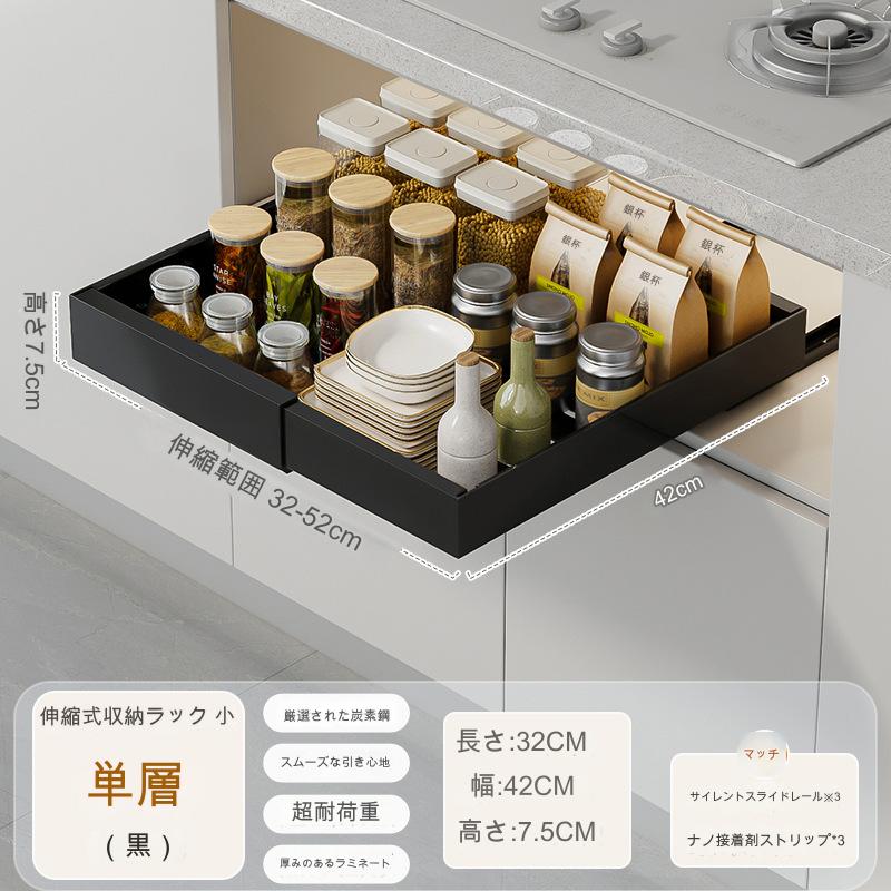 キッチン収納引き出し 伸縮式 穴開け不要 スライドレール付き 台所用 スライド 台所収納 小物整理 省スペース 調味料収納ラック