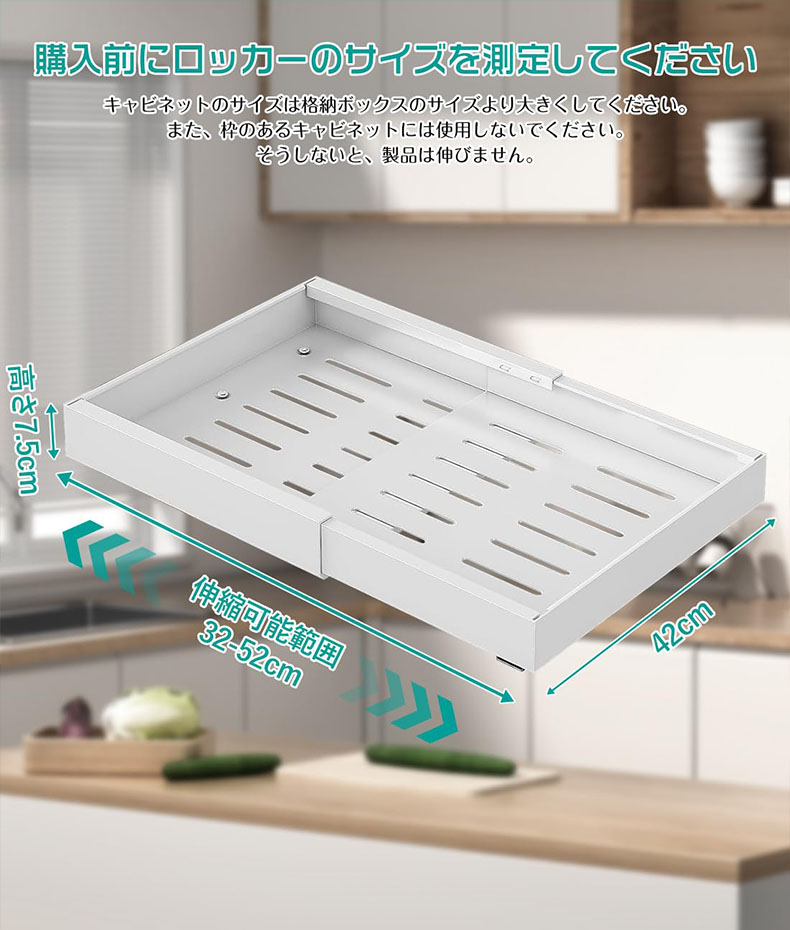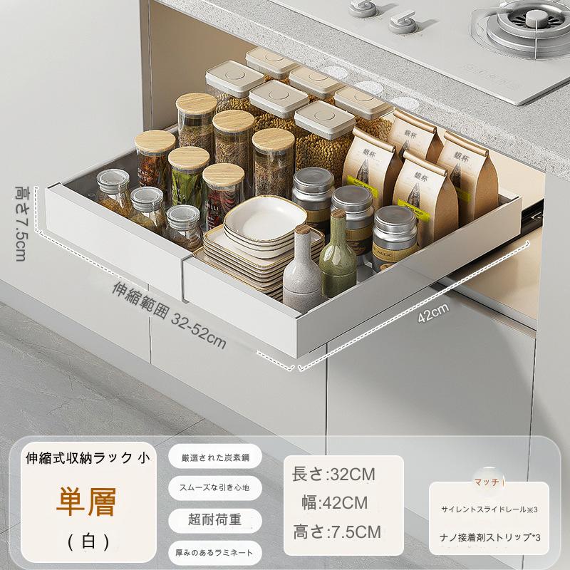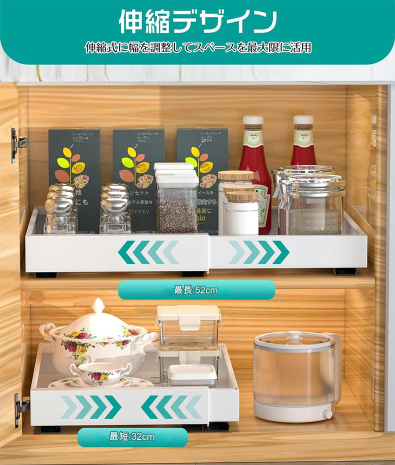 【調整可能なサイズ】このキッチン収納引き出しは、幅32cmから52cmまで伸縮自在で、様々なキッチンスペースにフィットします。必要に応じてサイズを調整できるため、シンク下やカウンター下など、限られたスペースでも最大限に利用することが可能です。