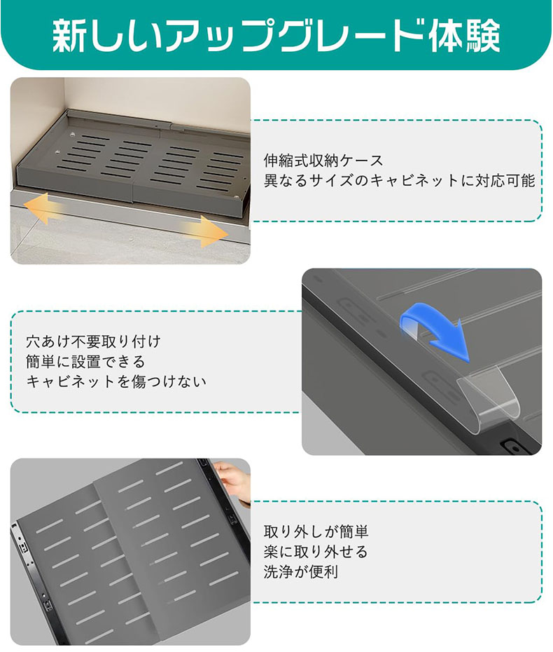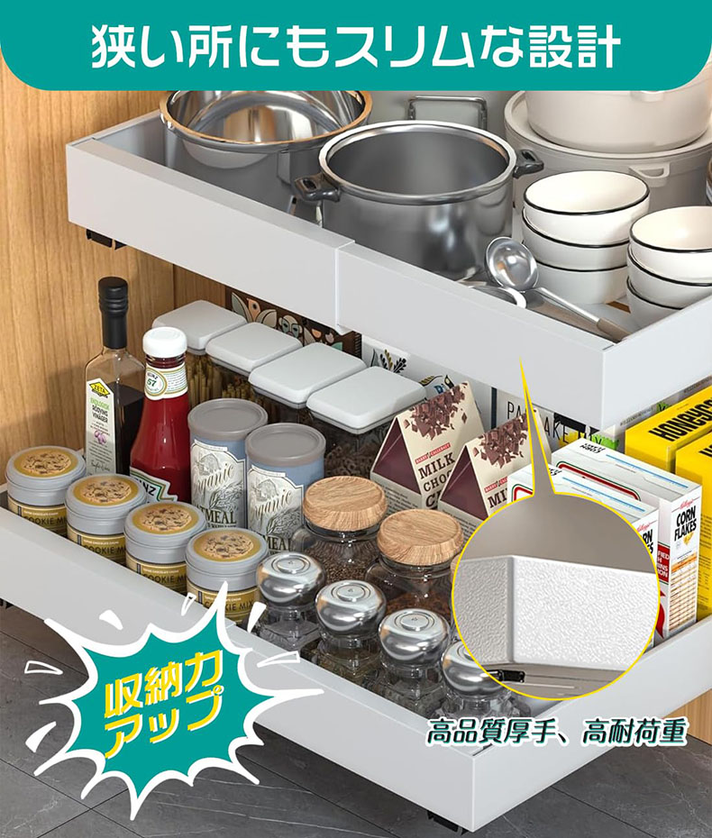【スペースを最大限に活用】コンパクトながらも、伸縮機能と効率的な収納設計により、限られたスペースを有効活用できます。シンクの下などの使われにくいスペースも、この引き出しを使うことで、収納場所として大変便利になります。