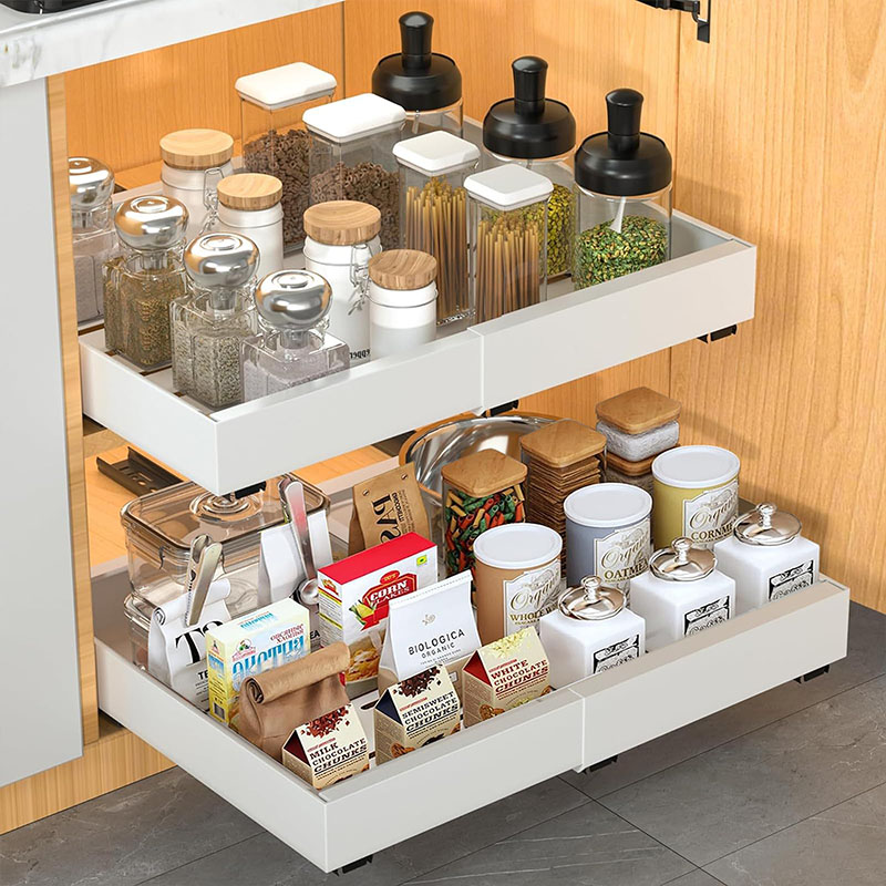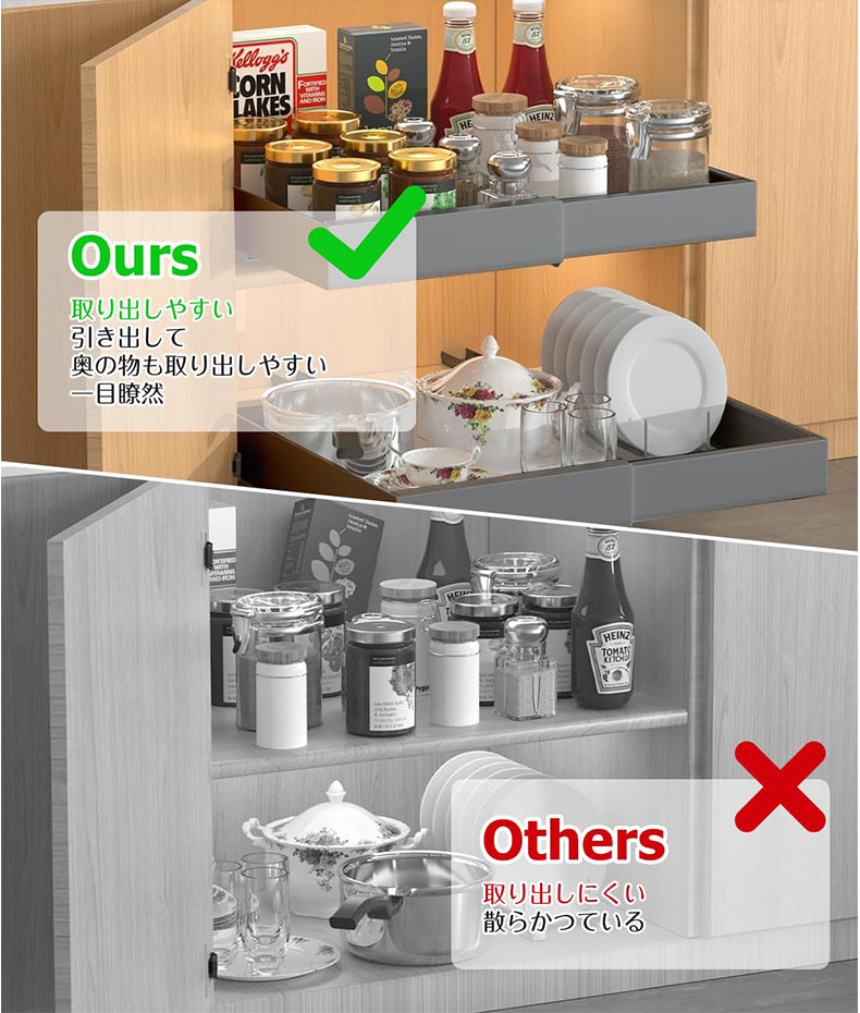 【多機能収納】スパイス、食器、調理器具など、様々なキッチン用品を整理整頓できる多目的収納引き出しです。引き出しの中は見やすく、取り出しやすい設計で、日常の料理がより効率的かつ快適に行えます。