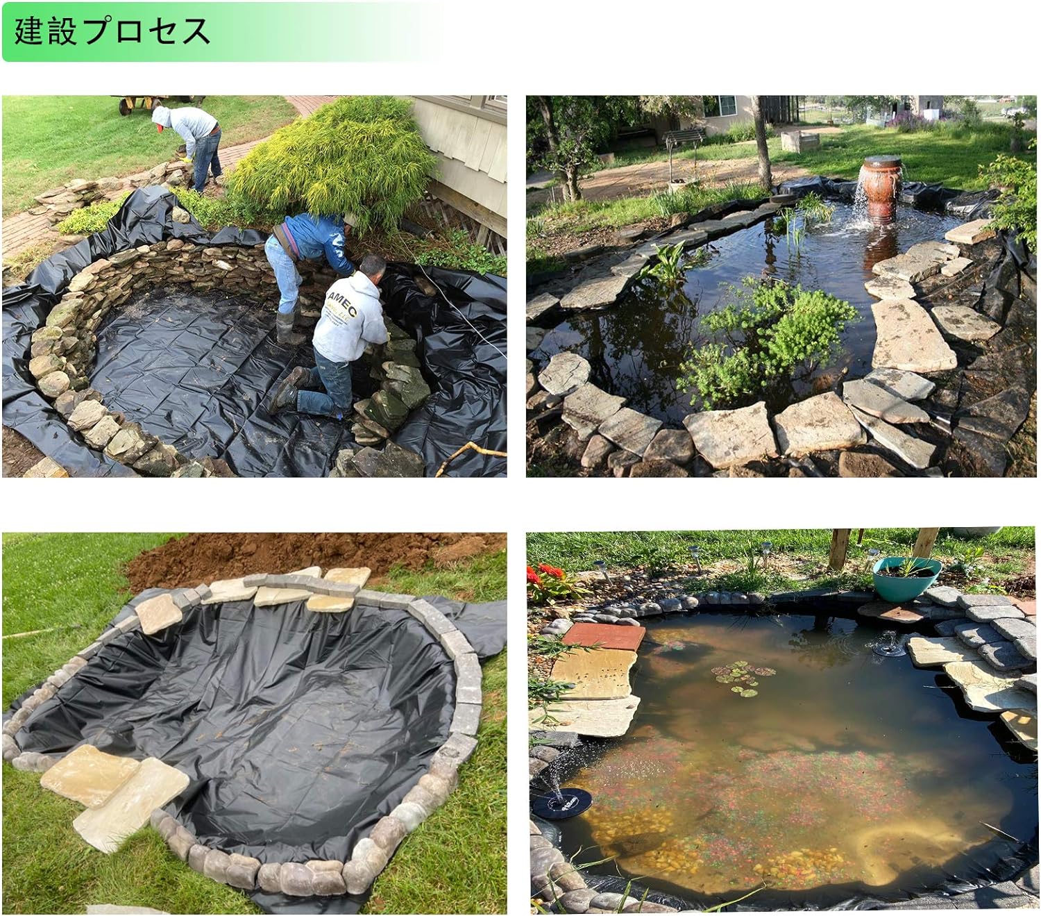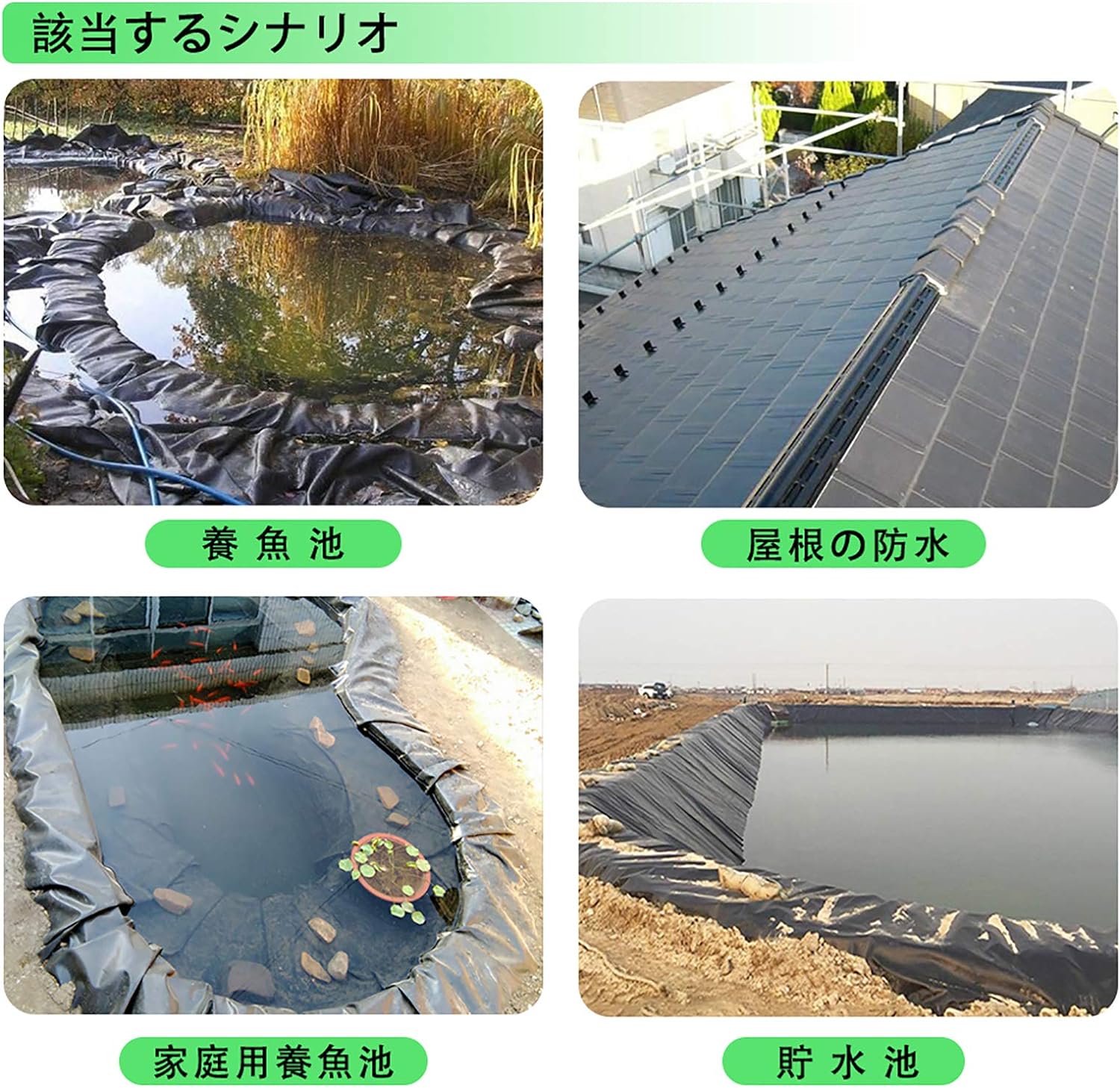 人工水池、屋根防水、(車両カバー)、仮設住宅、防湿マット、(キャンプ地面シート)、貯水池工事、生態環境工事など、多くのシーンで優れた性能を発揮します。
