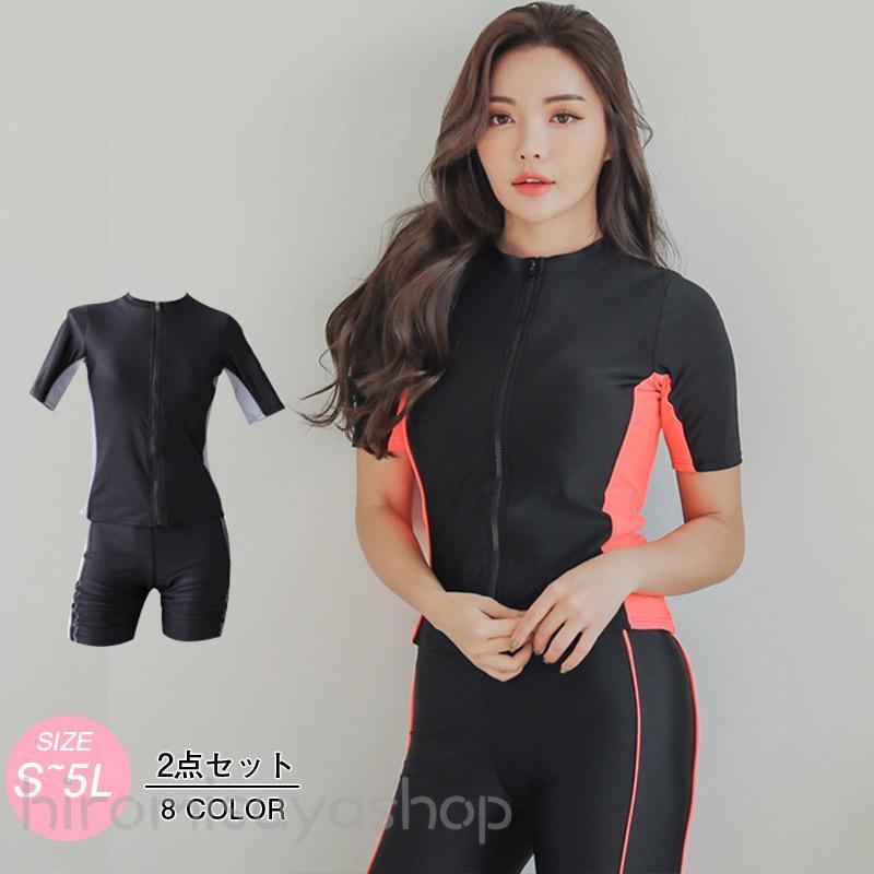 水着 レディース フィットネス水着 セパレート 半袖 めくれ防止 ジム プール 競泳水着 2点セット 水陸両用 体型カバー フロントジッパー