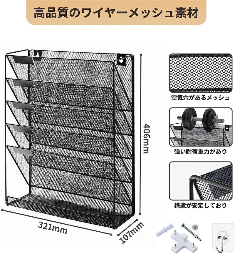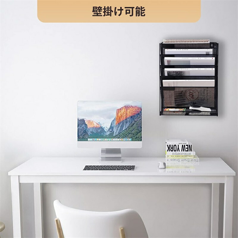 2つの丸い穴があり、壁に掛けたり、テーブルに置いたりできます。 ファイルの収納と整理に最適で、スペースを節約できます。カタログやパンフレットを手元に置くのに最適です。