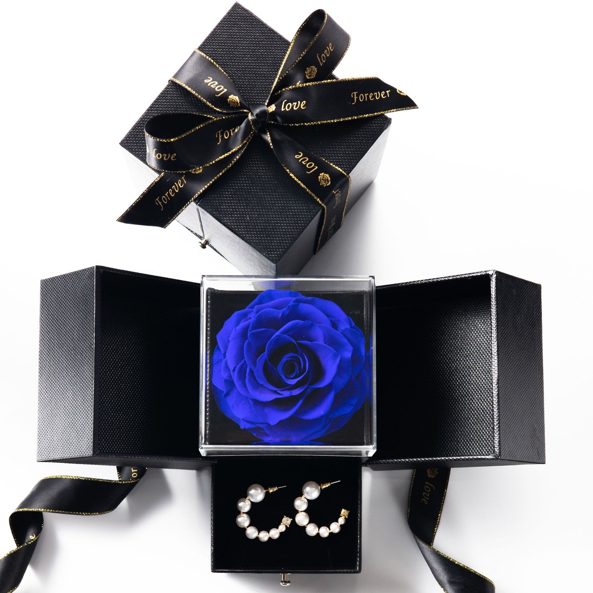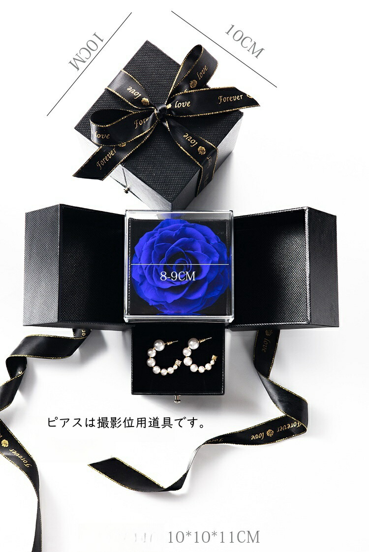 【仕様】製品サイズ:11cmx10cmx10cm。花材:薔薇、オースティンローズ。カラー:レッド、ブルー。包装:ギフト箱+クッション材。