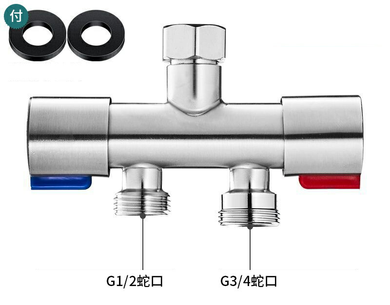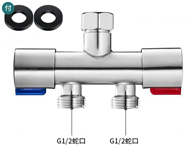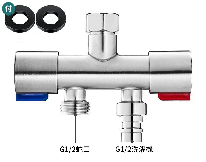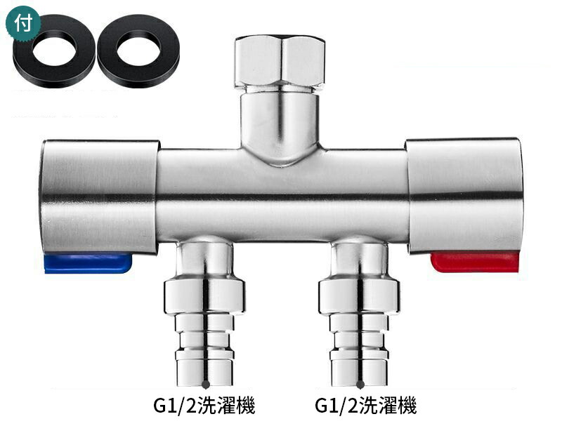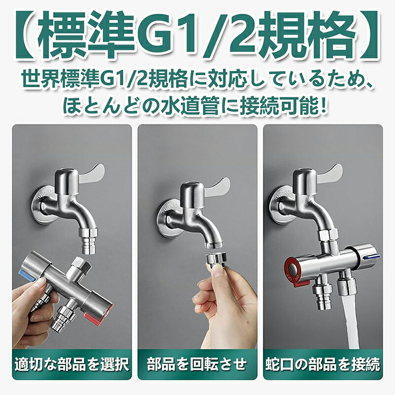 二股分岐のデザインを採用しており、洗濯機とバスルーム、キッチンなどの水道との同時接続を可能にします。独立したハンドルなので一方を洗濯機、もう一方を散水などの給水ホースに利用できます。G1/2規格に対応しており、ほとんどの水道管に接続できます。
