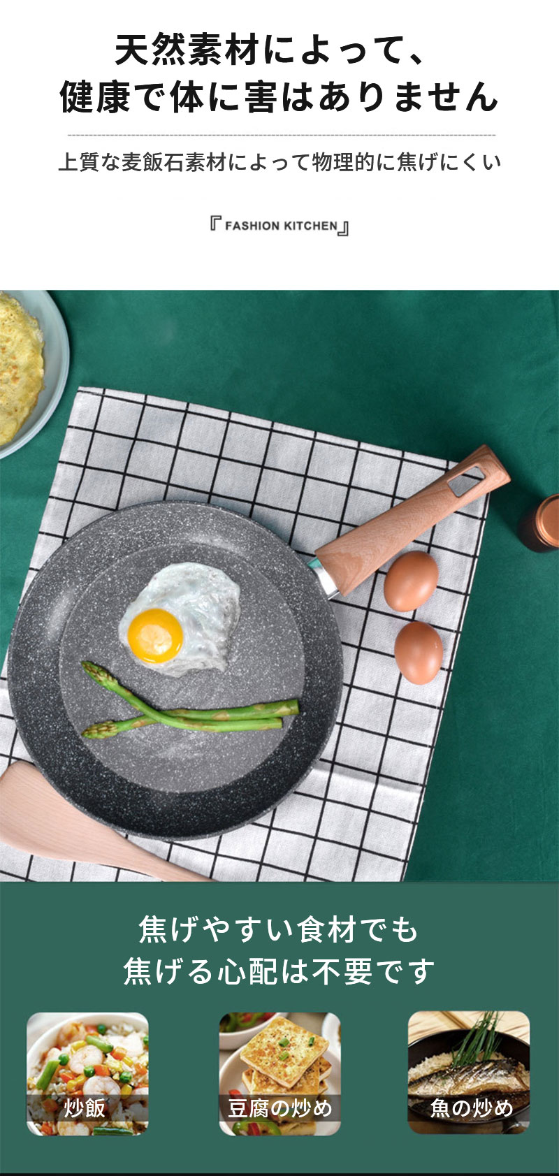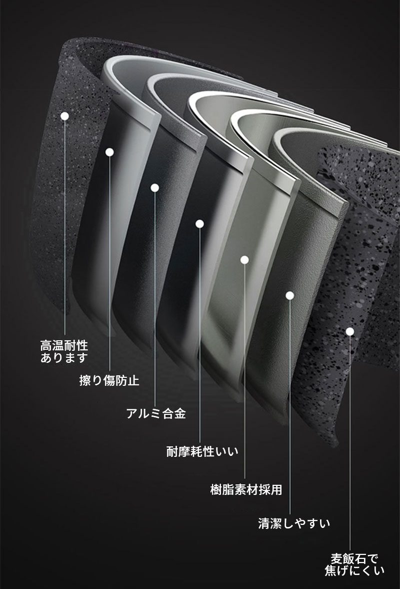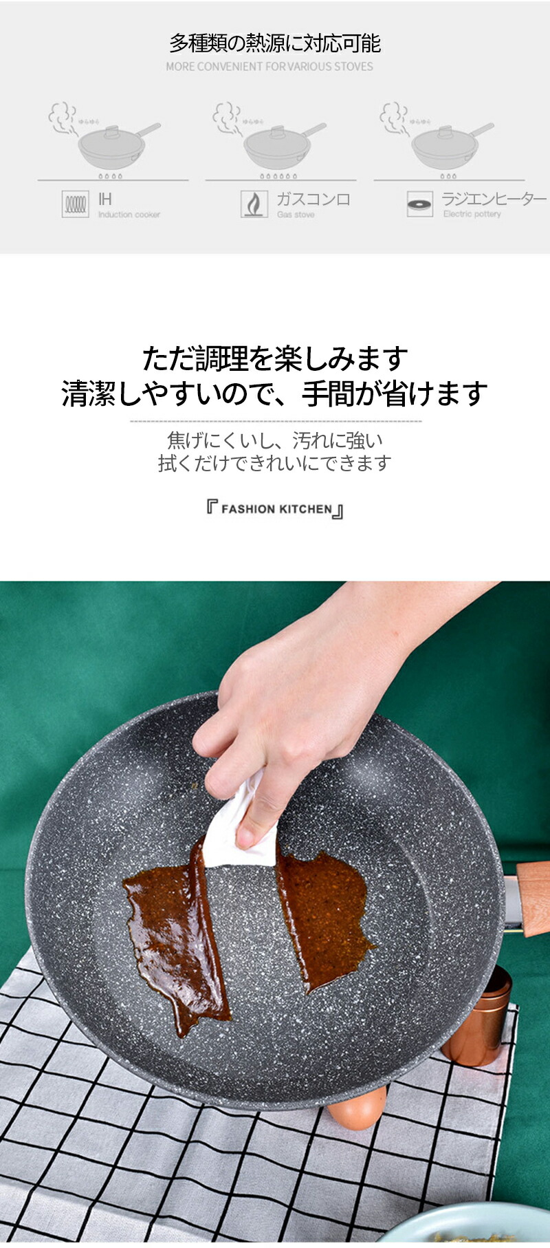 【快適な調理体験】、焦げ付きにくくスムーズに調理できます。調理後もスポンジで軽く拭くだけで、汚れもスルッと落ちます