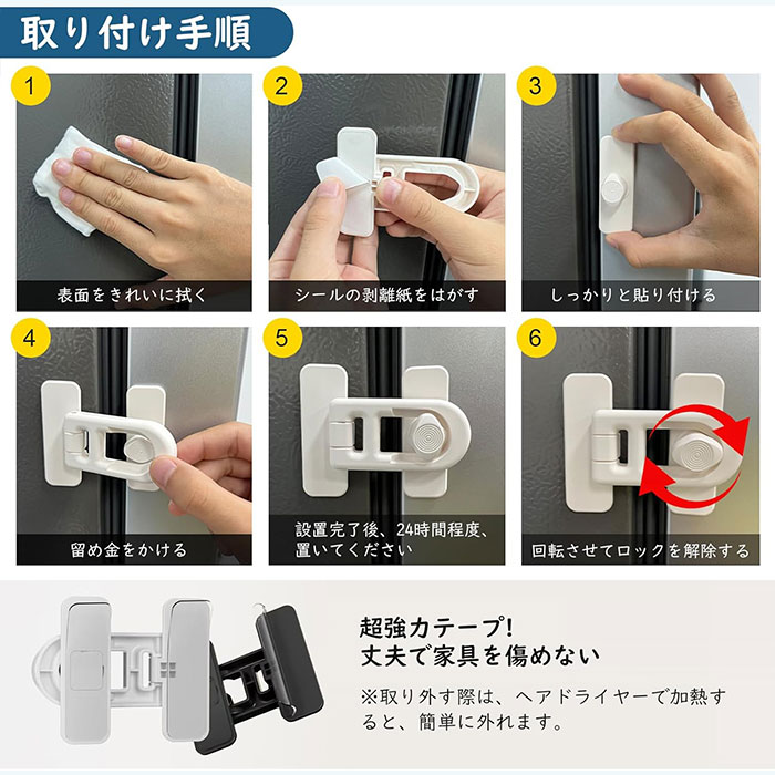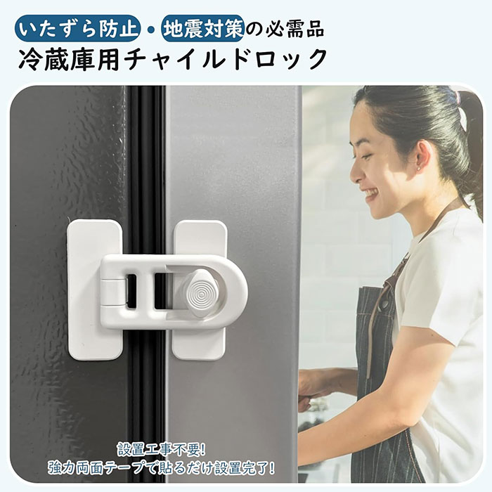 冷蔵庫のドアや引き出しに取りつけて、お子様のいたずらによる開閉や誤飲の防止に役立つ冷蔵庫ロックです。地震の際の散乱防止用やペットのいたずら防止用にもご使用いただけます。