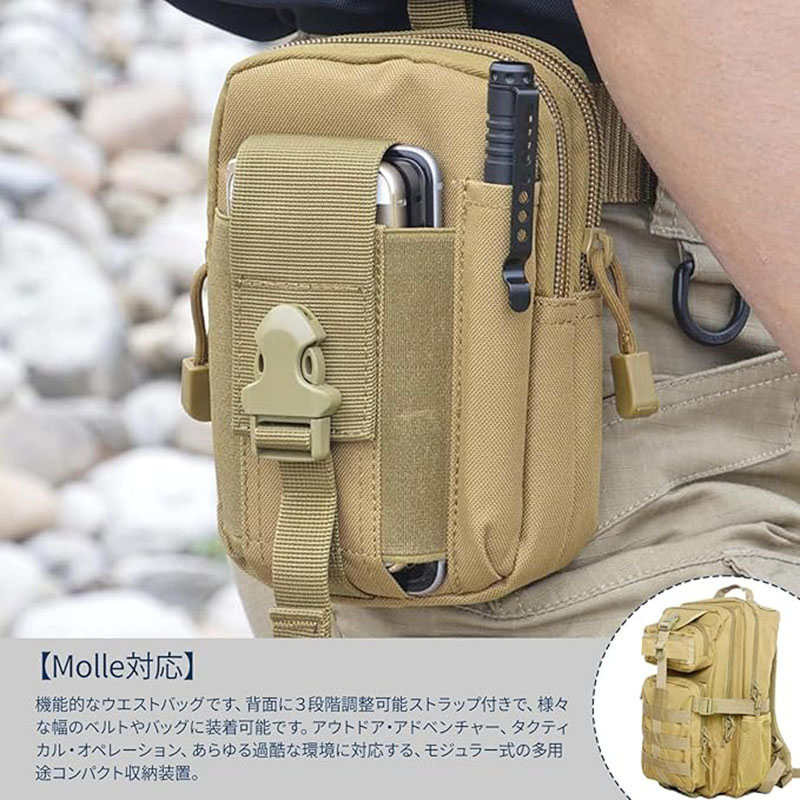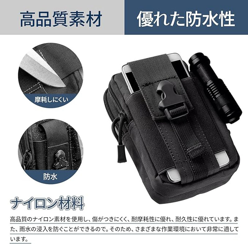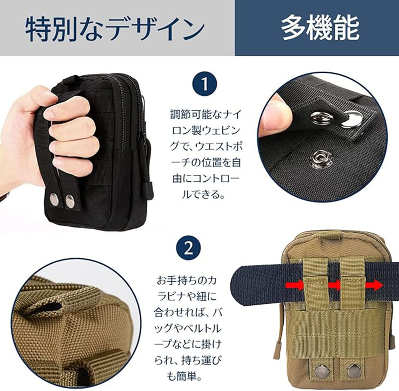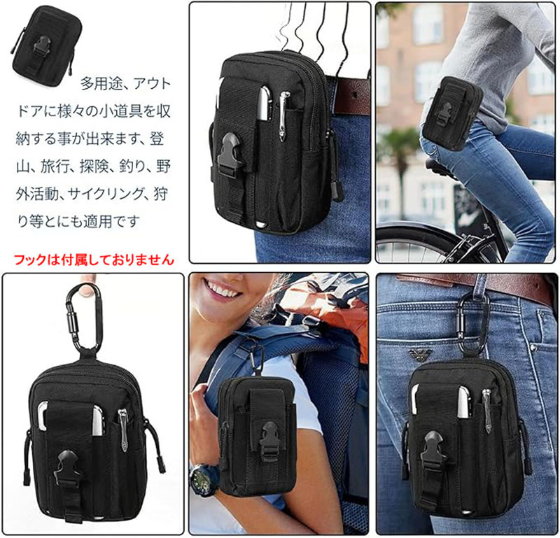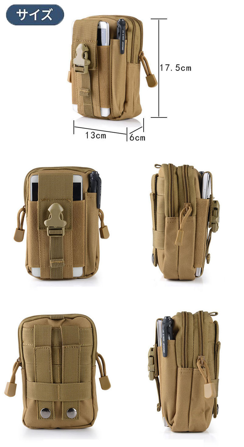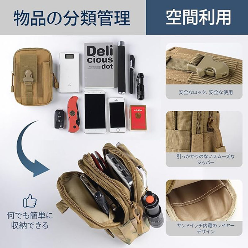 【多機能デザイン】17.5×13×6cm。小物を分類収納できるベルトポーチ。開口部が広く、出し入れが簡単で、日常使いからアウトドアまで便利です。