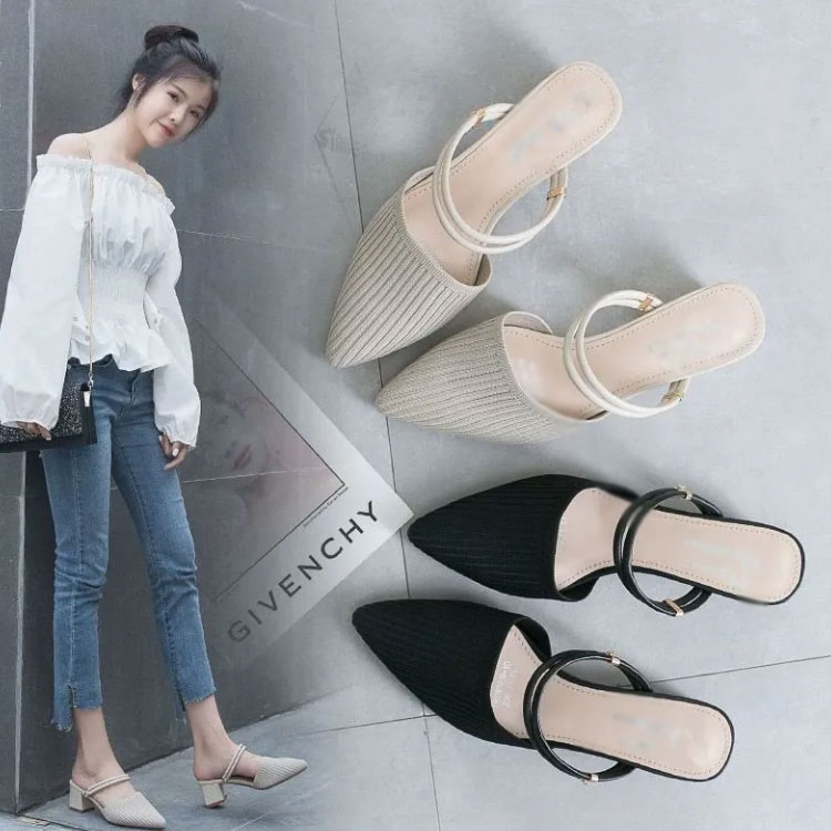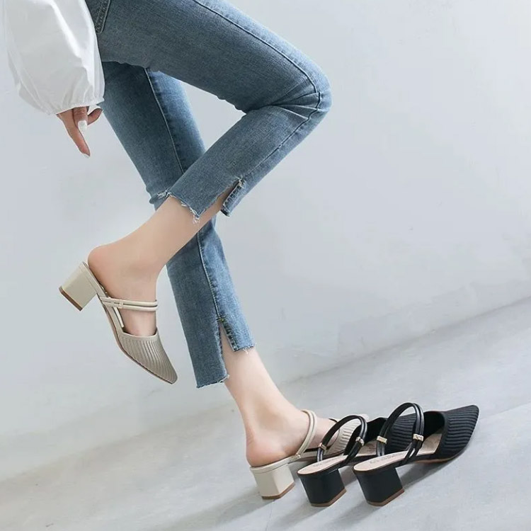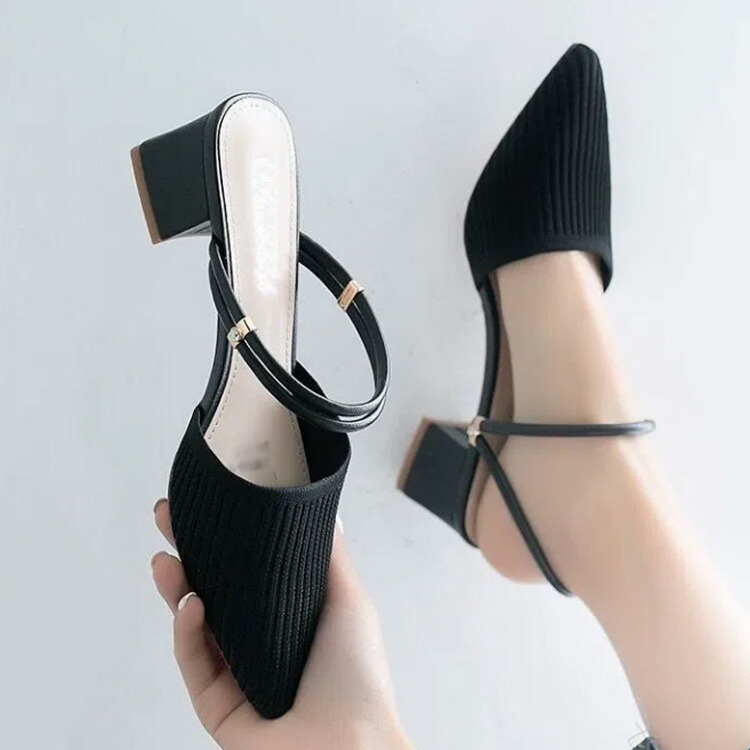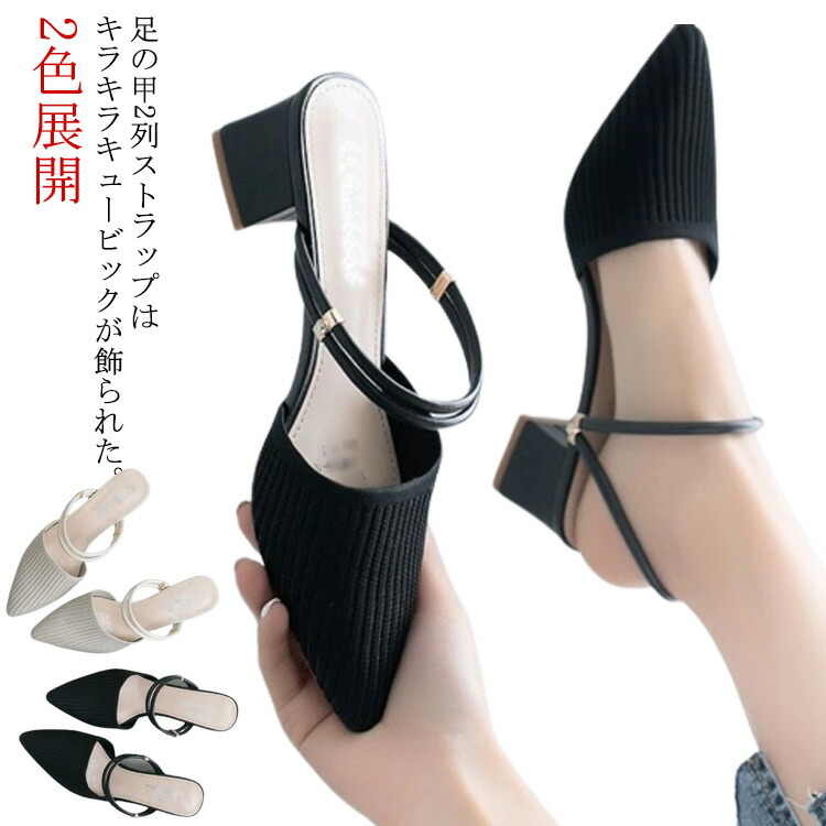 バックストラップ ミュール パンプス ローファー 2色展開 レディース ニット サンダル 太めヒール 春夏 痛くない 脱げない ポインテッドトゥ 美 2way 快適 エレガント チャン 通気