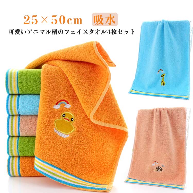 フェイスタオル 子供 タオル 綿 25×50cm 4枚セット かわいい もこもこ ふわふわ 吸水 子供用 キッズ ベビー 可愛い 動物 アニマル柄 4枚組 デイリー オシャレ 幼稚園 保育園 柔らかい