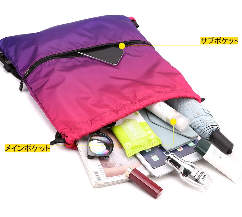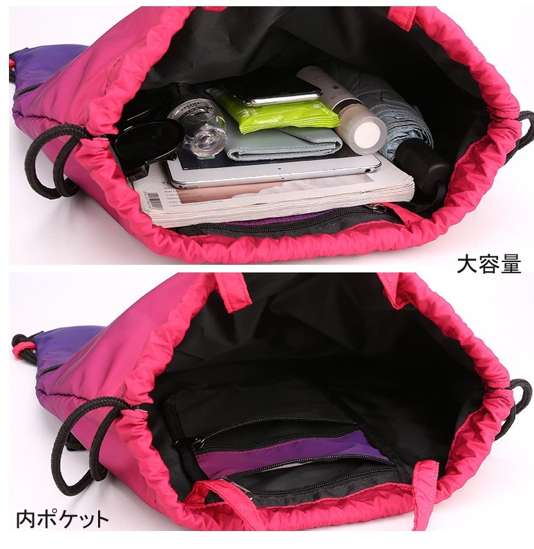 ・軽量・撥水性のあるナップサックで、様々なシーンで活躍!ヨガやジムなど室内スポーツ用のジムバッグや水泳、スイミング教室、ビーチ遊び、海遊び、水遊び、磯遊びグッズのお片付けプールバッグや部活動、夏休みイベント、温泉旅行、修学旅行、花見、花火大会、お祭り時の着替え衣類と浴衣収納用の巾着バッグやちょっとした買い物や防災時の非常持ち出し袋にもご使用いただけます。