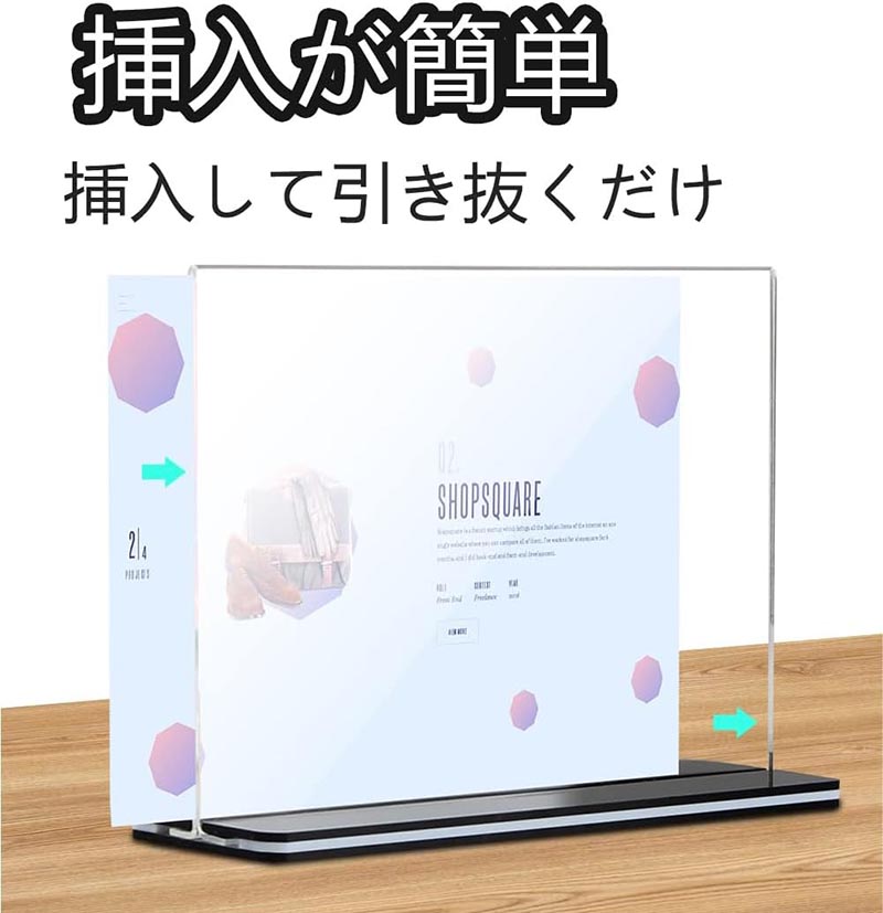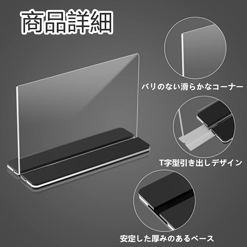 【抜群の透明度】透明アクリルサインホルダーは丈夫で透明度が高く、100%透明なアクリル素材で、クリアで鮮やかな画像表示を提供し、製品情報、プロモーション、ブランディング、説明書、写真やアートワークの表示に最適です。日光に当て続けても黒ずんだり黄ばんだりせず、優れたディスプレイとなります。注:超クリアなディスプレイのため、使用前に保護フィルムを剥がしてください。