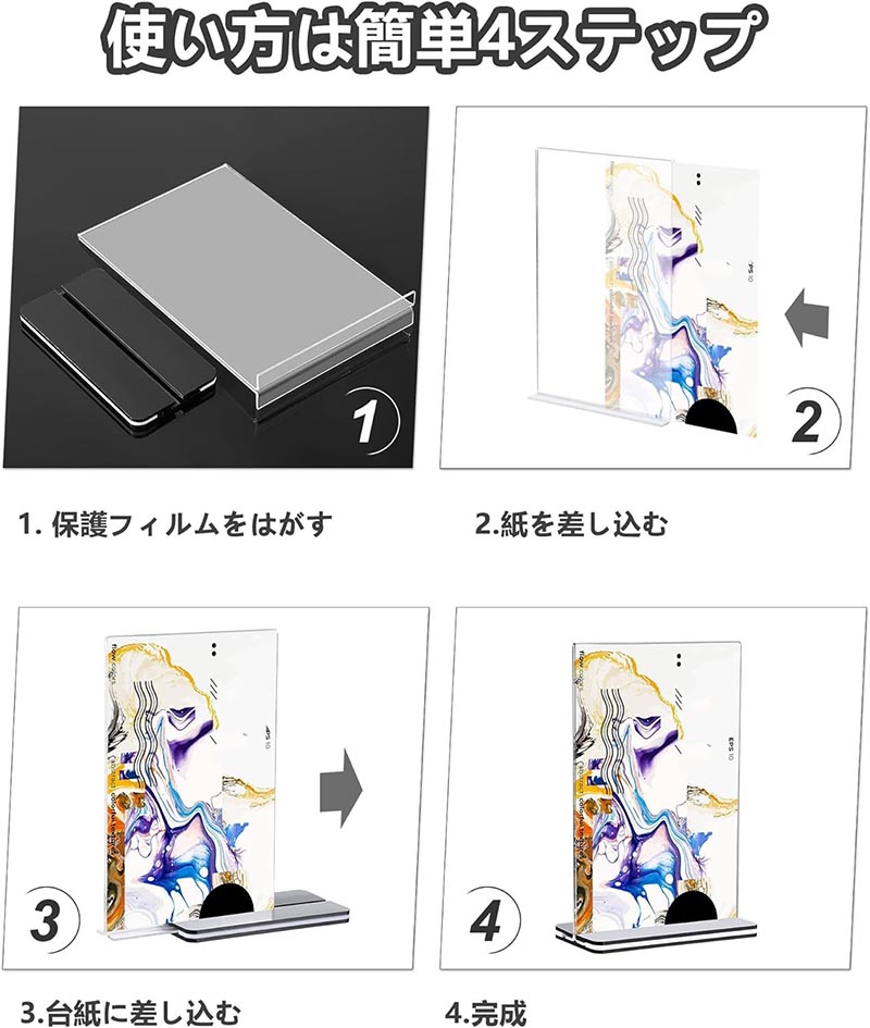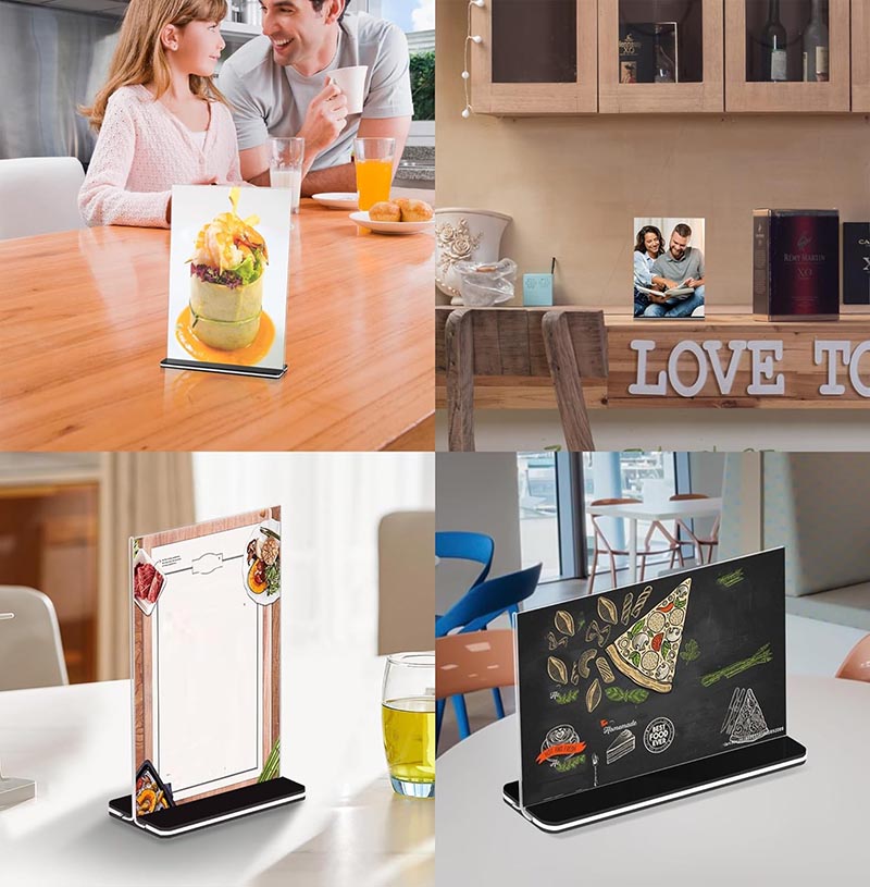【簡単設置】ユニークなベースデザインにより、このメニュースタンドは超簡単に使用できます。組み立ても簡単で、アクリル板から保護フィルムを剥がし、ディスプレイ素材を挿入し、ベースに挿入するだけです。この工程により、スムーズで効率的な設置が可能になり、思い通りの画像を表示することができます!