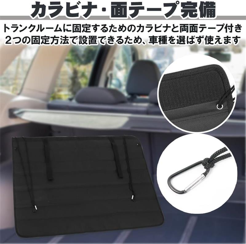 ▲設置方法は簡単で、カラビナをトランクルーム内のフックに引っ掛けリアバンパーを広げて動かないように裏面を面テープで固定するだけで設置完了。2ステップで設置できるので一人でも気軽にご使用いただけます。