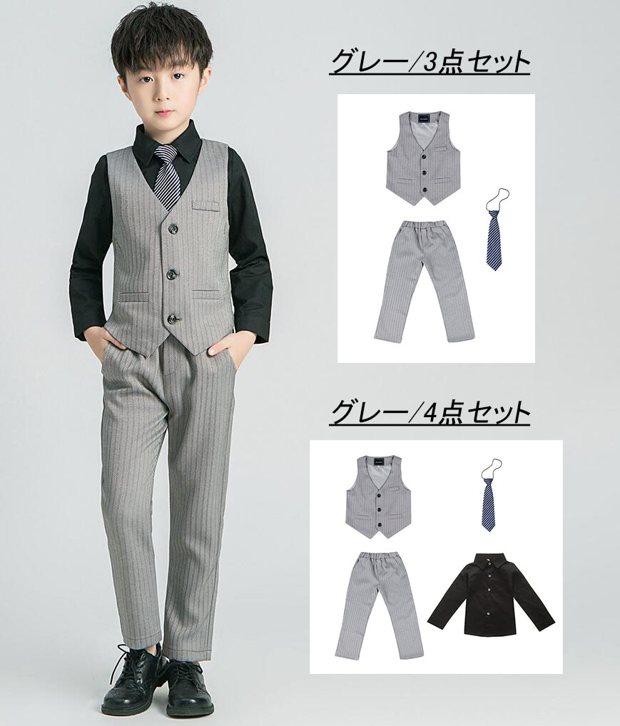 子供フォーマルスーツセット 子供服 キッズ紳士服 男の子礼服 3点セット 4点セット選べる ブラック フォーマル 子どもベスト ズボン ネクタイ付き フォーマルセット ストラップ 縞柄 演奏会 発表会 結婚式 卒園式 七五三 黒 グレー 90 100 110 120 130 140 150 160 170